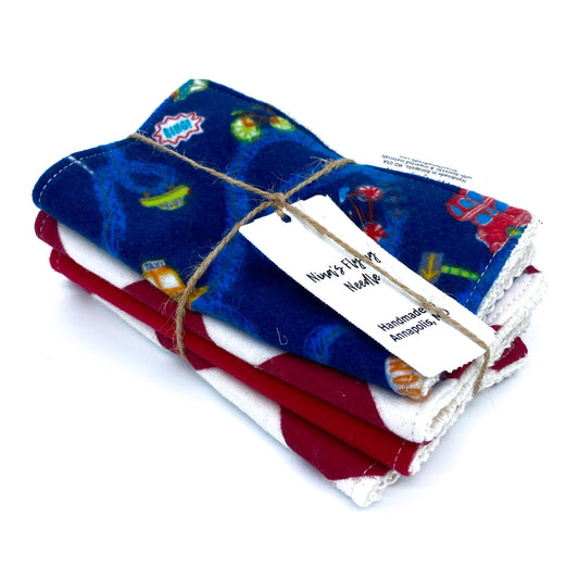 Eliminate disposables in your bathroom. We are calling our versatile cloths wash cloths, but really they could also be called baby wipes, toddler napkins, facial wipes, ... you name it! We combine a soft organic french terry with an even softer flannel fabric to allow you to easily apply skin care products, cleanse, remove make up, or wipe away sticky messes.
