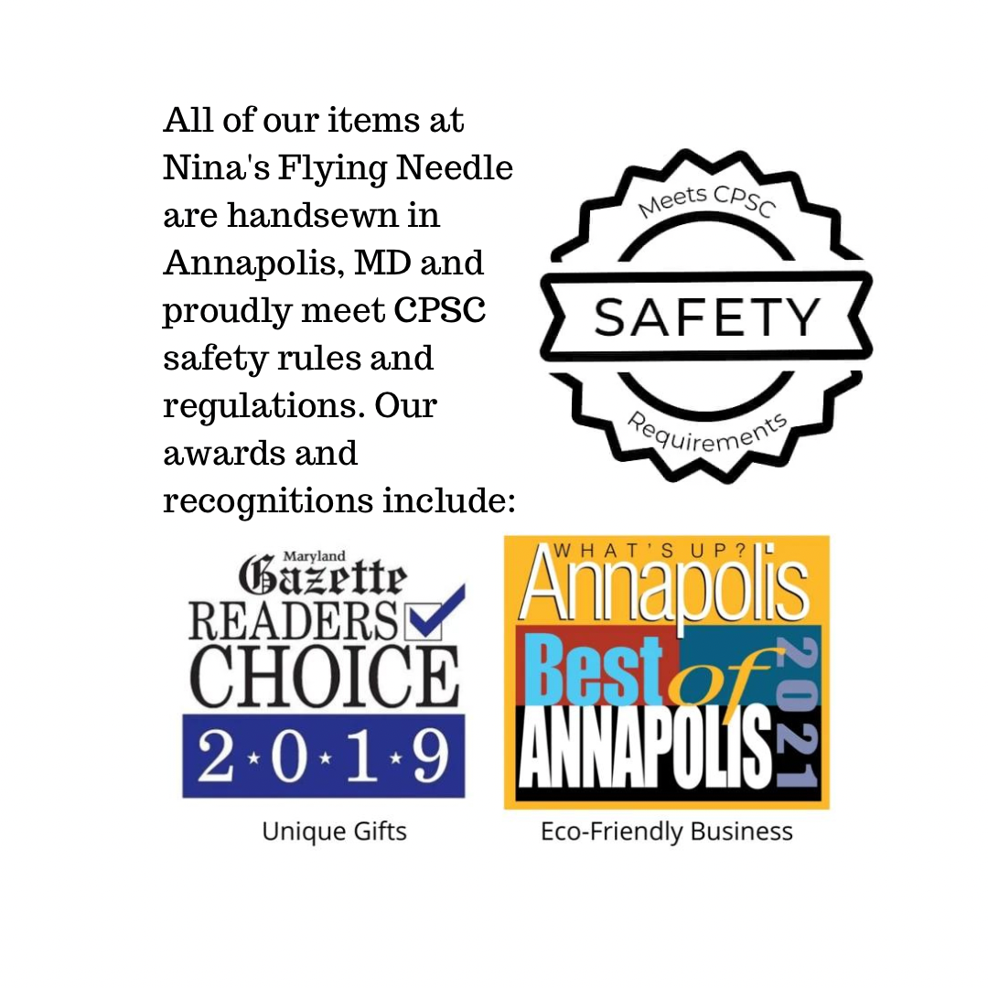 All items made by Nina's Flying Needle meet CPSC safety rules and regulations. For more information on these federal guidelines, please refer to CPSC Safety Requirements.