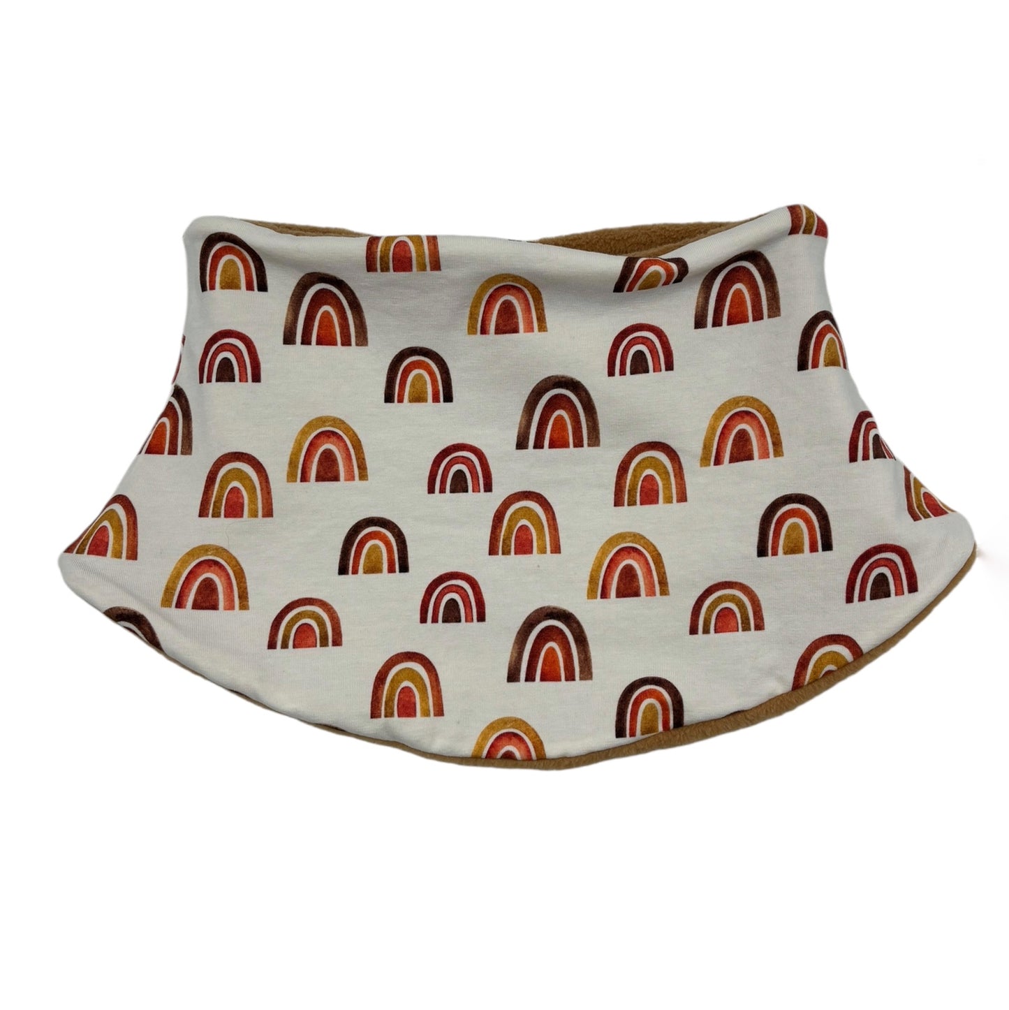 Expertly crafted, this neck warmer boasts a soft, knit fabric with rainbow details in caramel tones on a cream background. The interior is lined in luxurious caramel colored fleece, providing comfort and warmth for any adult. Effortlessly convenient, it can be easily put on or removed without the need for zippers, velcro, or added bulk. It is the ideal accessory for baby wearing or nursing, and can be easily washed with other like-colored items on a cold cycle before being tumble dried on low or line dried.