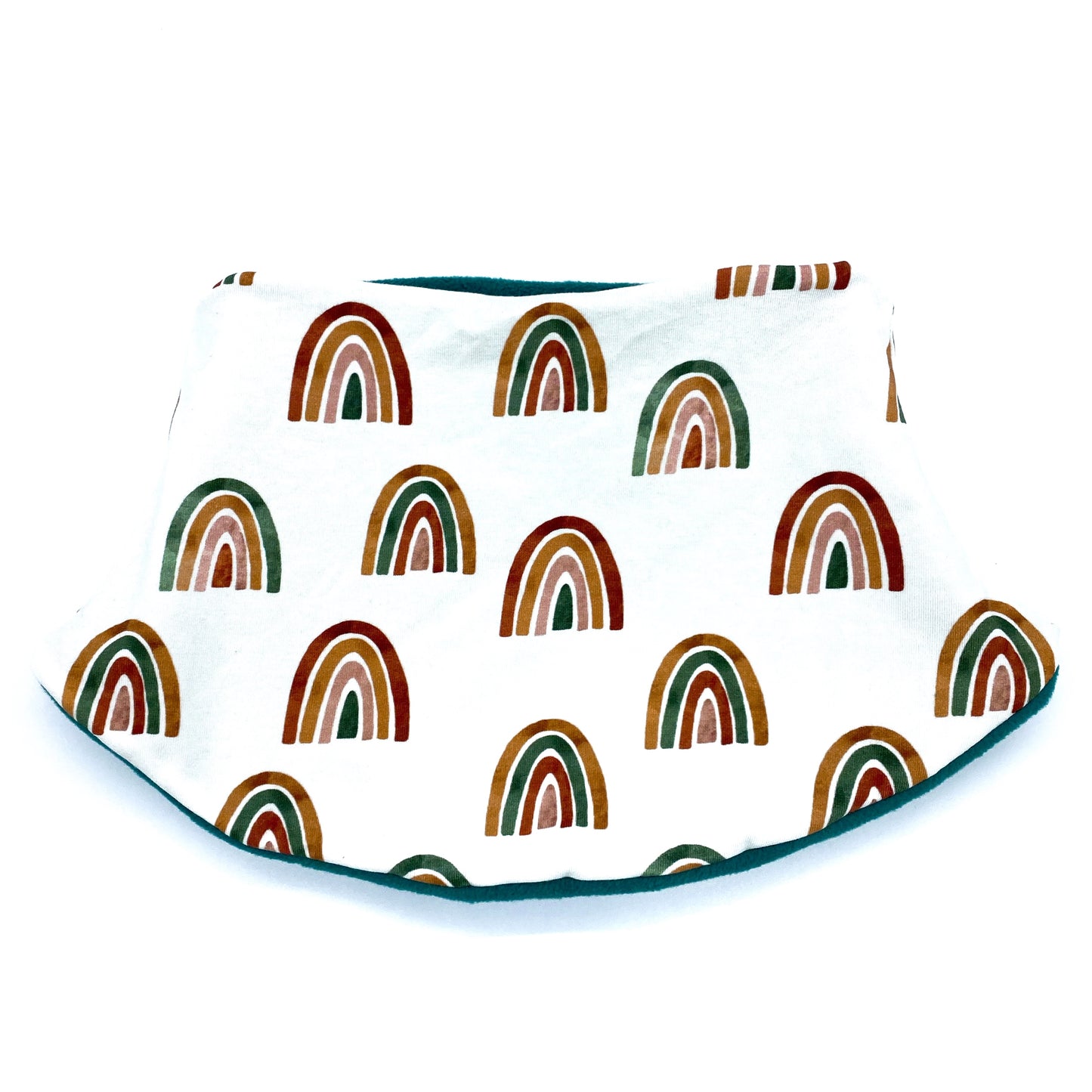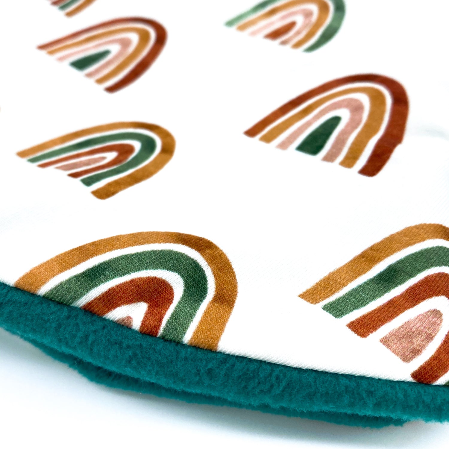 Expertly crafted, this neck warmer boasts a soft, knit fabric with rainbow details in earth and green tones on a cream background. The interior is lined in luxurious sea green fleece, providing comfort and warmth for any adult. Effortlessly convenient, it can be easily put on or removed without the need for zippers, velcro, or added bulk. It is the ideal accessory for baby wearing or nursing, and can be easily washed with other like-colored items on a cold cycle before being tumble dried on low or line dried.