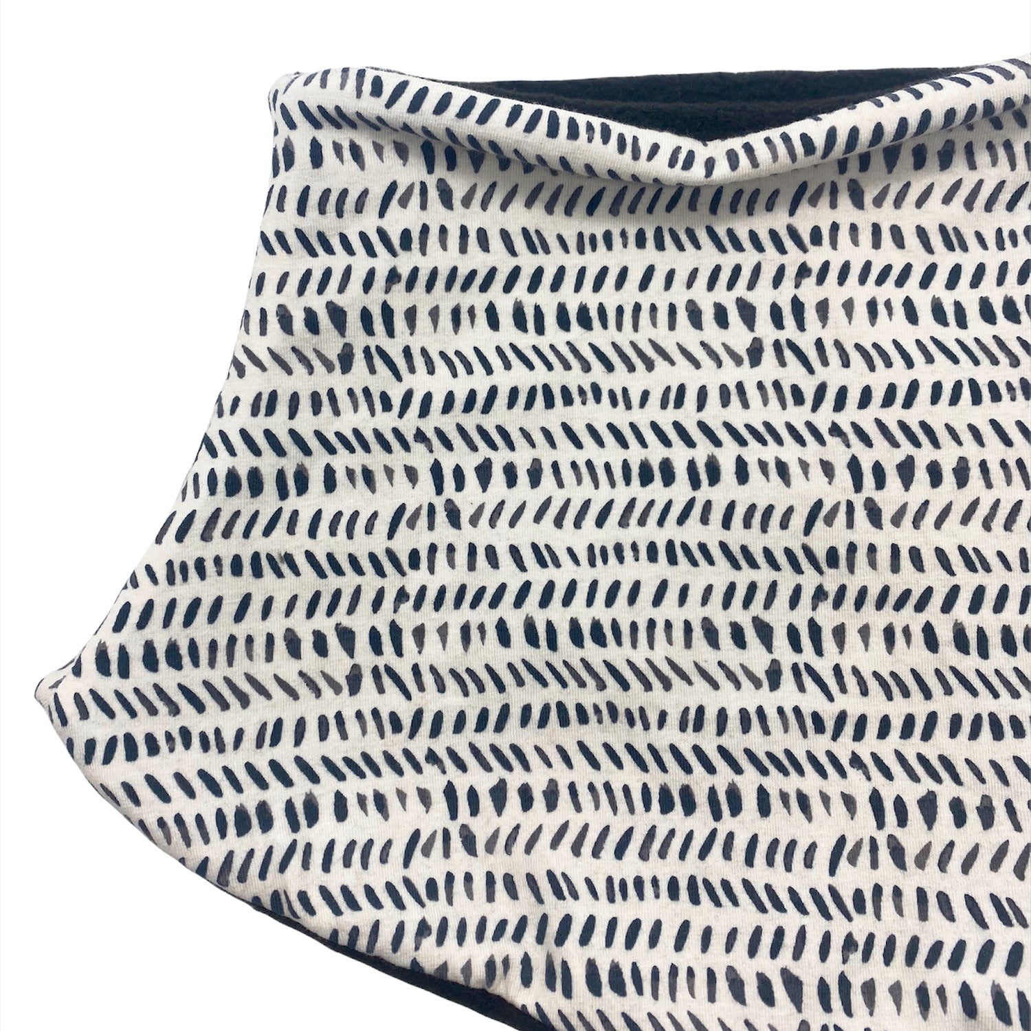 This neck warmer is hand-crafted and designed for adults of all sizes. Made with soft knit fabric displaying scattered, white birds on light brown, it is lined with luxurious off-white fleece for ultimate comfort. Easy to put on or take off, it eliminates the need for zippers, velcro, or extra bulges. Suitable for baby wearing and nursing, it can be washed on cold with like colors and tumble or line dried.