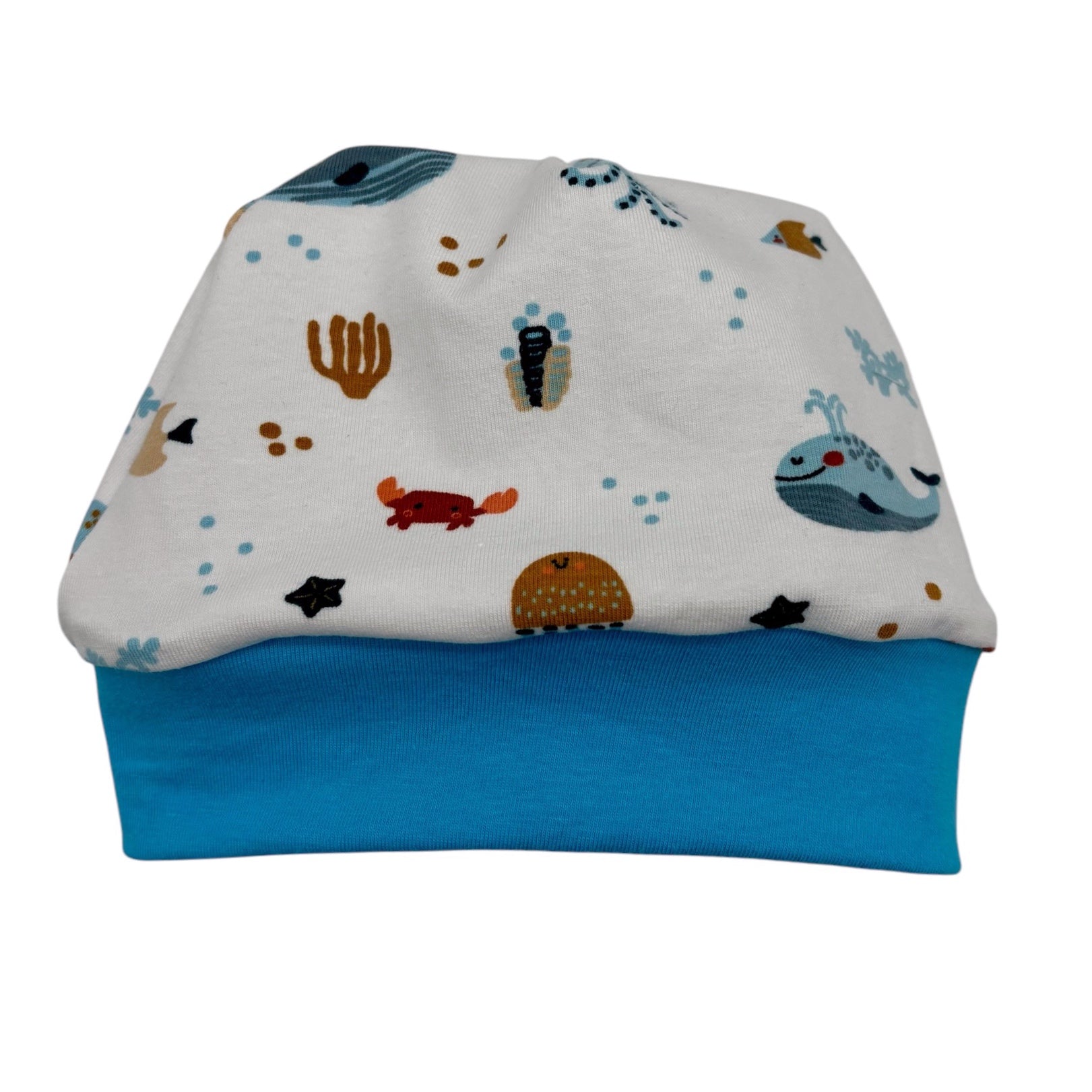 Expertly crafted beanie-style hat, hand-sewn with precision. Recommended for babies up to 12 months, with a circumference measurement of 16 inches. Featuring a whimsical print of ocean animals with a solid aqua blue brim. Made from a soft knit fabric that provides incredible warmth and comfort for baby. Composed of 95% cotton and 5% Lycra Spandex, this hat is perfect for year-round use and makes a great baby shower gift. Free of chemicals and toxins, it is safe and gentle for sensitive skin. Care instructions: machine wash on cold and tumble dry low or lay flat.