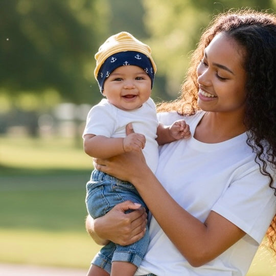 Expertly crafted beanie-style hat, hand-sewn with precision. Recommended for 1-4 year olds with a circumference measurement of 18 inches. Featuring a yellow and white stripe print and a brim with anchors. Made from a soft knit fabric that provides incredible warmth and comfort for baby. Composed of 95% cotton and 5% Lycra Spandex, this hat is perfect for year-round use and makes a great baby shower gift. Free of chemicals and toxins, it is safe and gentle for sensitive skin. Care instructions: machine wash on cold and tumble dry low or lay flat.