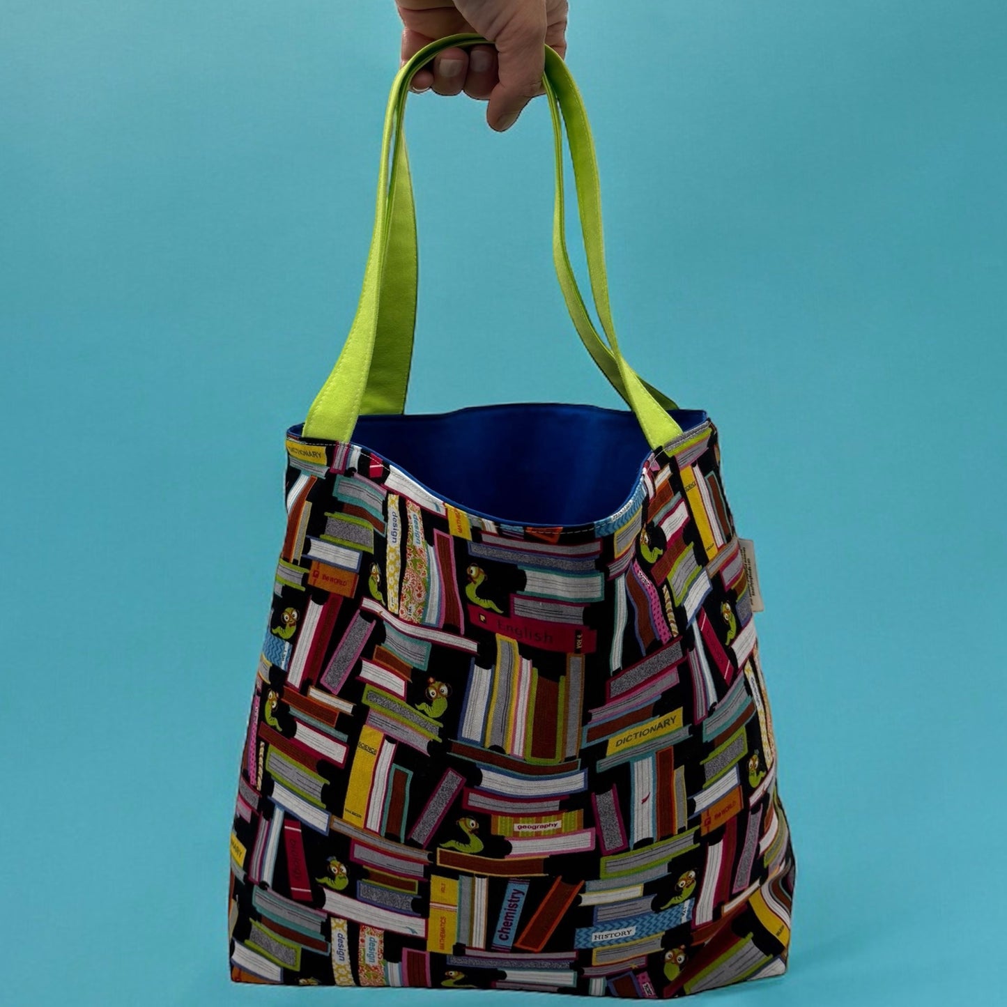The Children's Library Sized Reversible Tote Bookworms features colorful book and bookworm designs on the exterior, with a solid royal blue interior and key lime green handles. This fully washable and reversible tote is the perfect size for hardcover books and can also be used to carry and store sports equipment. It measures 11x13x4 inches and can be easily washed in the machine, tumble dried on low, and ironed as needed.