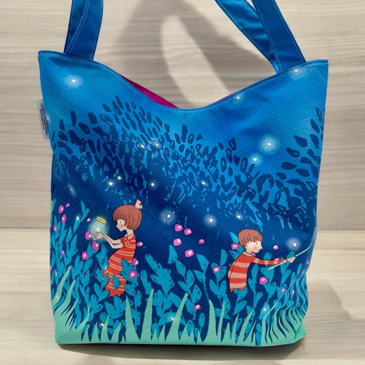 This Children's Library Sized Reversible Tote features a whimsical print of kids catching fireflies on the exterior, with a solid pink interior and handles that have fireflies. This fully washable and reversible tote is the perfect size for hardcover books and can also be used to carry and store sports equipment. It measures 11x13x4 inches and can be easily washed in the machine, tumble dried on low, and ironed as needed.