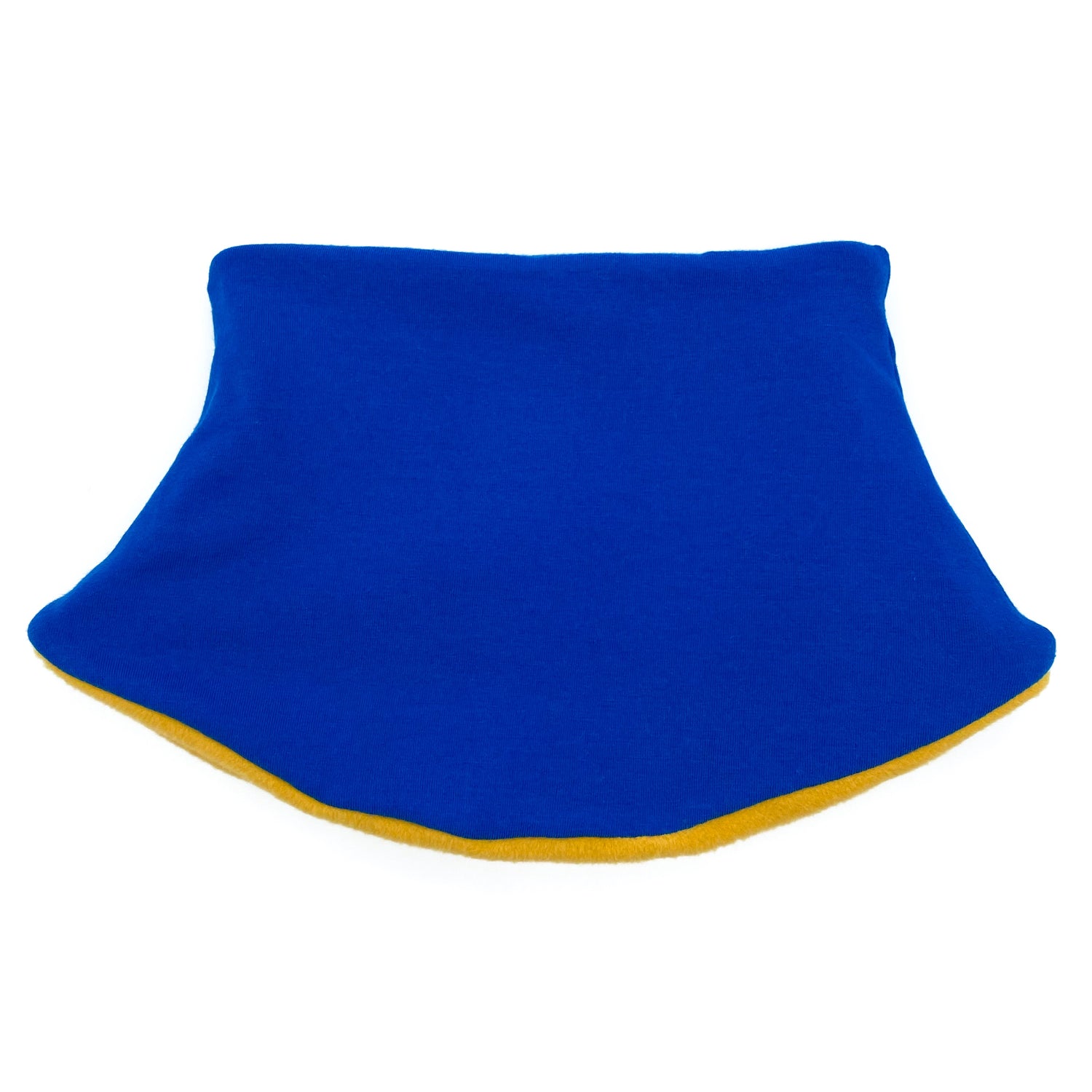 This neck warmer is handmade with care and features a soft knit fabric in a solid royal blue color. It is lined in luxurious yellow fleece and comes in three sizes for children: 1-3 years, 3-6 years, and 6-9 years. Perfect for keeping young ones comfortable and warm, it is easy to put on and take off without the need for zippers or extra bulges. For easy care, simply wash on cold with similar colors and either tumble dry on low or hang to dry.