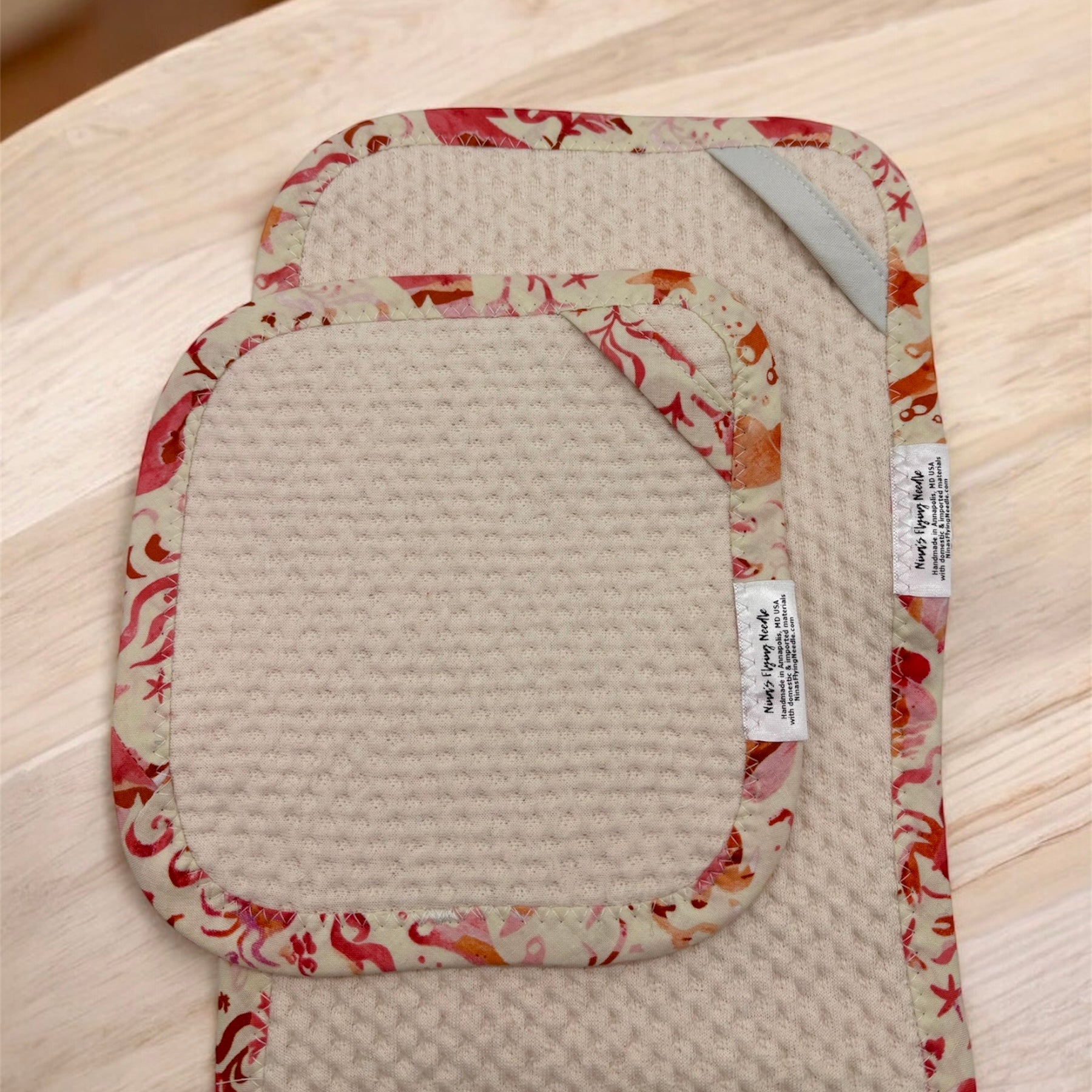 This set of 2 reusable paper towels is expertly crafted with precision. It includes both a STANDARD and a TINY size. The design is a print of ocean animals and plants in coral water colors. Made with 100% organic cotton fabric, these towels possess impressive Organic Antimicrobial properties and are both BPA-free and hypoallergenic. These towels are highly absorbent and exceptionally durable, hand-stitched with quality fabric from the USA. Measuring at 12 x 7.5 inches in size, they also come with a convenient hook for easy storage and drying.
