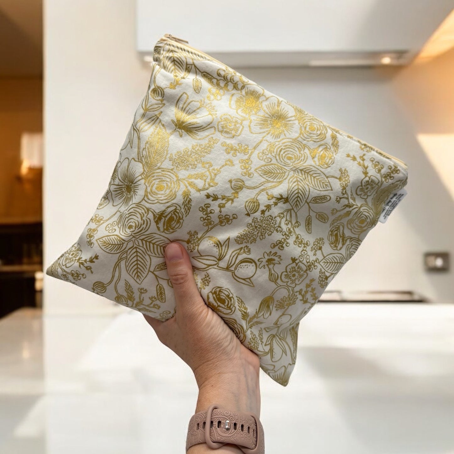 This reusable bag features a sparkly, gold floral, complemented by a light golden zipper. Perfect for lunches, travel, or storage, it measures 10.5 x 10 inches and is food safe, free of toxins. The bag also boasts easy-to-use lead-free zippers and can be easily cleaned by turning inside out and wiping, or thrown in the washing machine when needed. Hang to dry for best results.