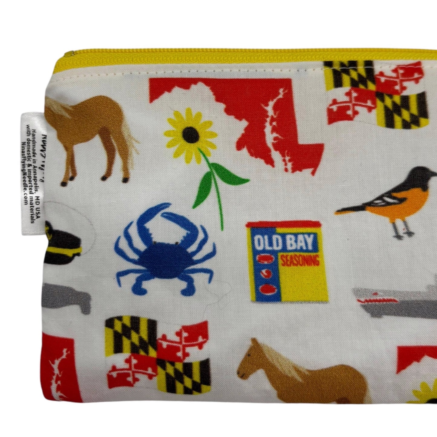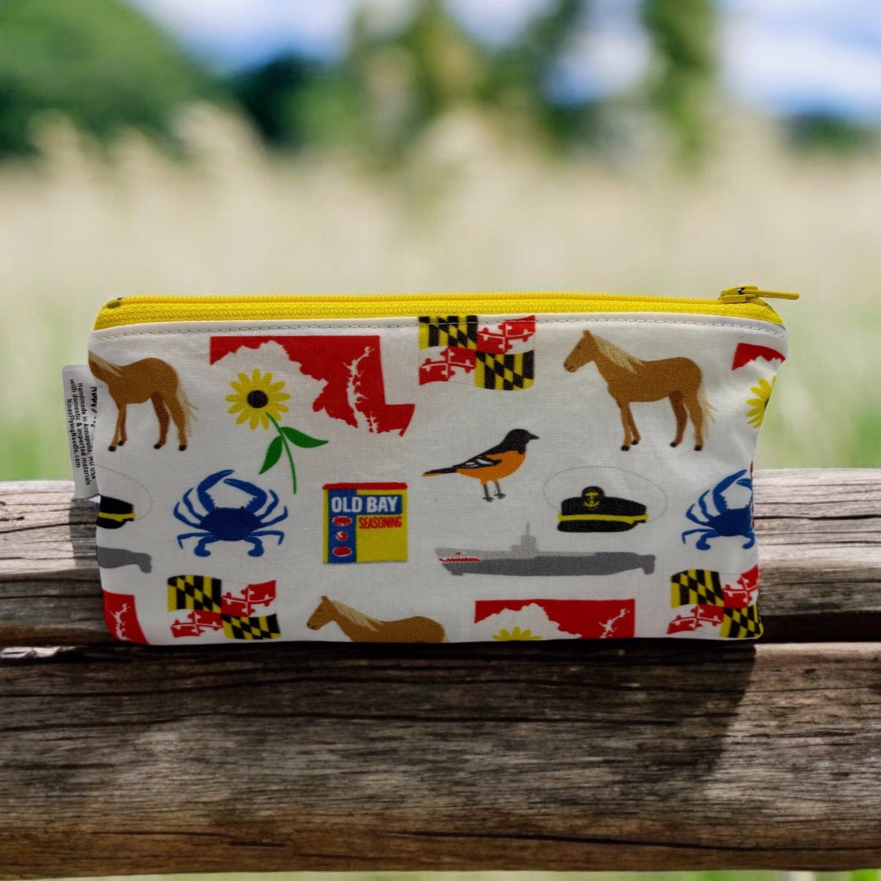 This reusable zippered bag features a Maryland icon print with a yellow zipper. It is hand-sewn and measures 7.5 x 4 inches, making it the perfect size for holding items such as crayons, colored pencils, or markers. It is also great for storing sunglasses, lipsticks, makeup, nail polish, and travel items, as well as hygiene products, keys, and phone. This bag is food safe and free of toxins, with quality and lead-free zippers that are easy to handle. To clean, simply turn the bag inside out and wipe or toss it in the washing machine and hang to dry.
