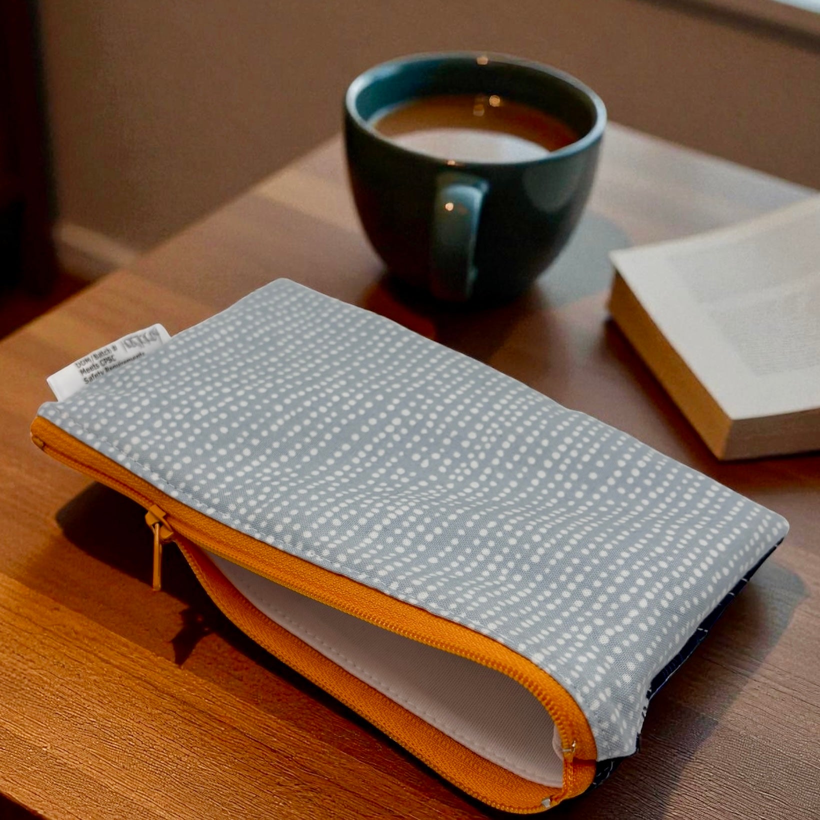 This reusable zippered bag features a combo print of planets on one side and dots on blue on the other side. The bag has with a yellow zipper. It is hand-sewn and measures 7.5 x 4 inches, making it the perfect size for holding items such as crayons, colored pencils, or markers. It is also great for storing sunglasses, lipsticks, makeup, nail polish, and travel items, as well as hygiene products, keys, and phone. This bag is food safe and free of toxins, with quality and lead-free zippers that are easy to handle. To clean, simply turn the bag inside out and wipe or toss it in the washing machine and hang to dry.