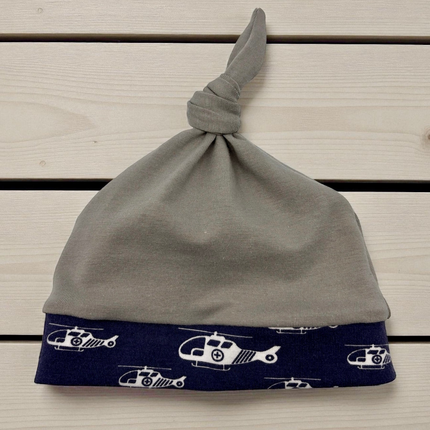 Expertly hand-sewn knot hat in the Newborn size. Features a solid gray print with a helicopter band. Made with a soft knit fabric of 95% Cotton and 5% Lycra Spandex, providing ultimate comfort for your baby. Versatile for all seasons and makes a great baby shower gift. Ideal for sensitive skin as it contains no chemicals or toxins. Easy care instructions: machine wash on cold and tumble dry low or lay flat to dry.