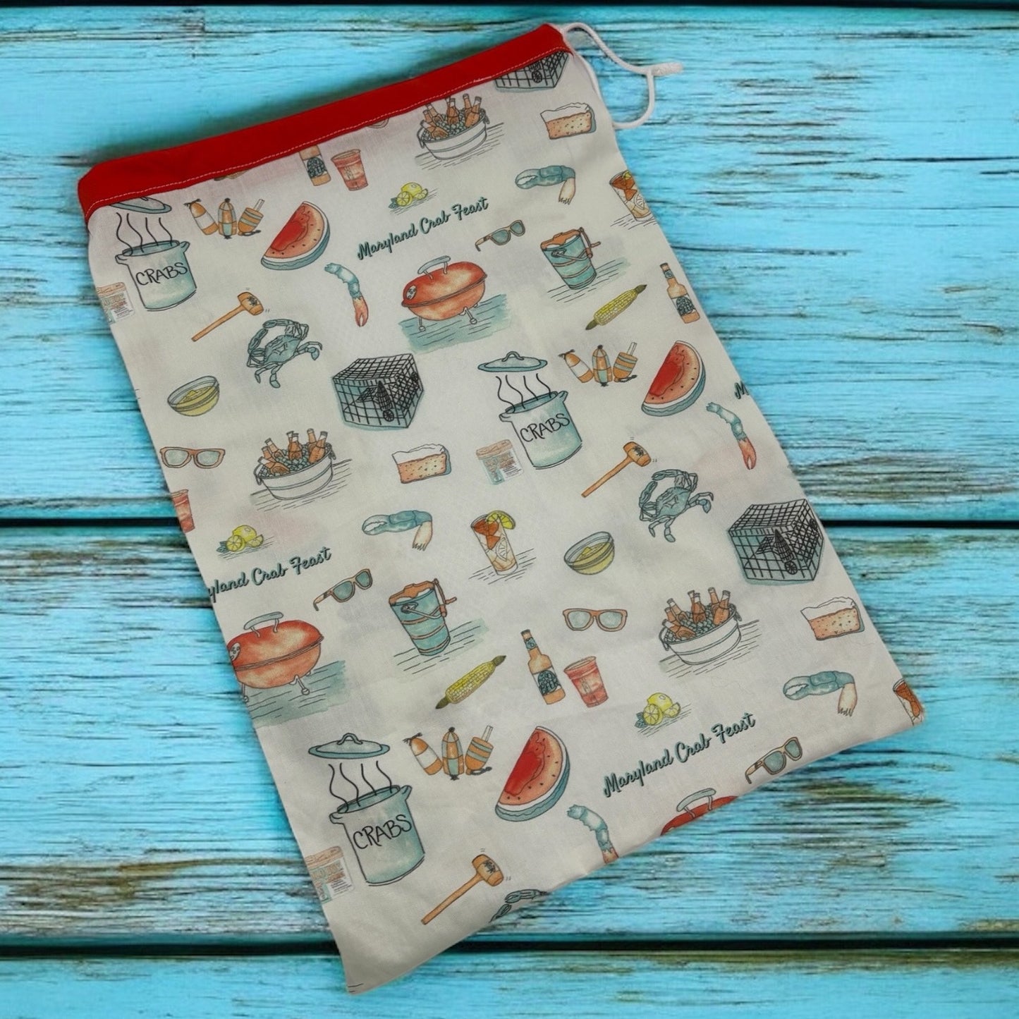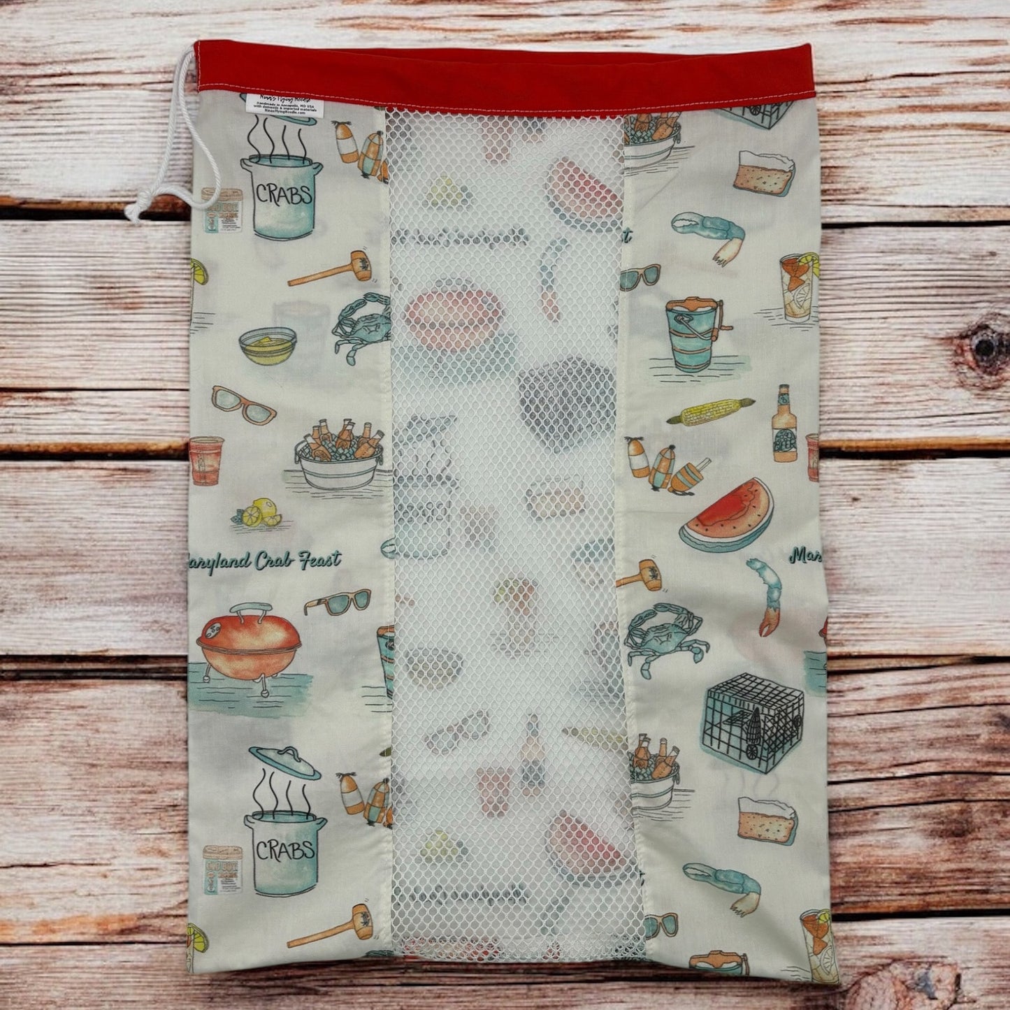 This product is a hand-sewn, reusable produce bag for longer, bulkier produce items. It measures 18 x 12.5 inches, and it is larger than a standard plastic grocery bag. The drawstring closure and tag with tare weight make it ideal for use at checkout. Its Maryland Crab Feast design with a solid orange/red rim adds a touch of style to your shopping experience. For best results, machine wash cool and hang dry or iron as needed. This produce bag is food safe and free of toxins, perfect for keeping your groceries fresh and safe.