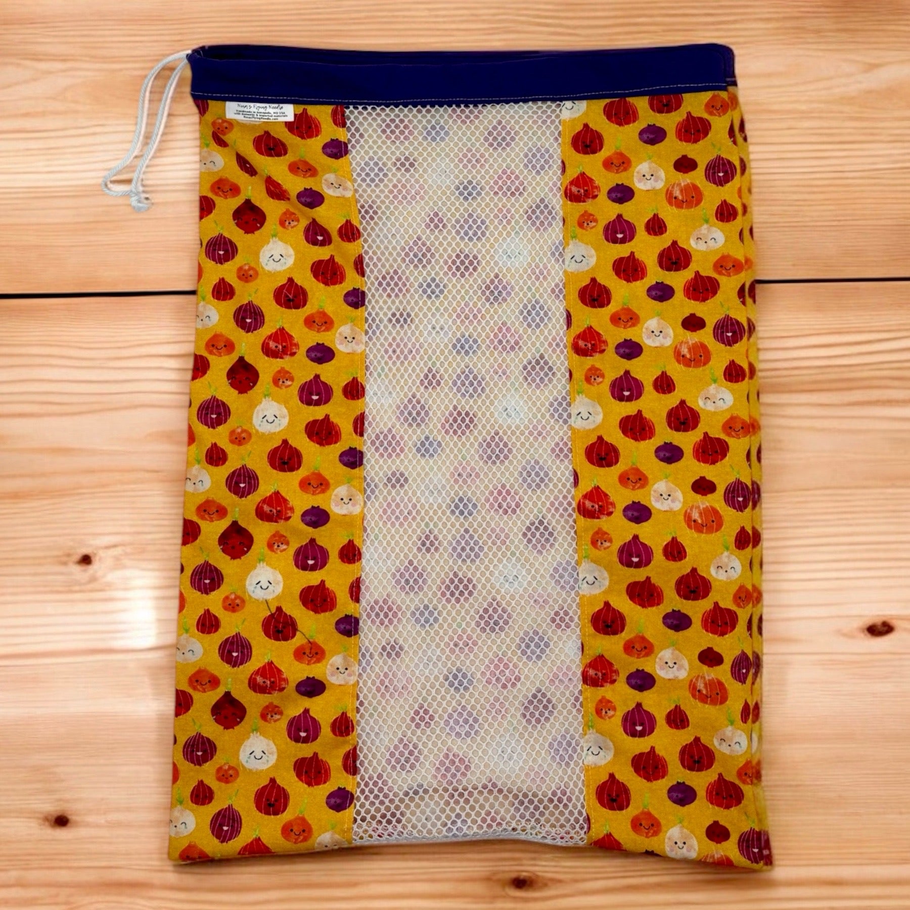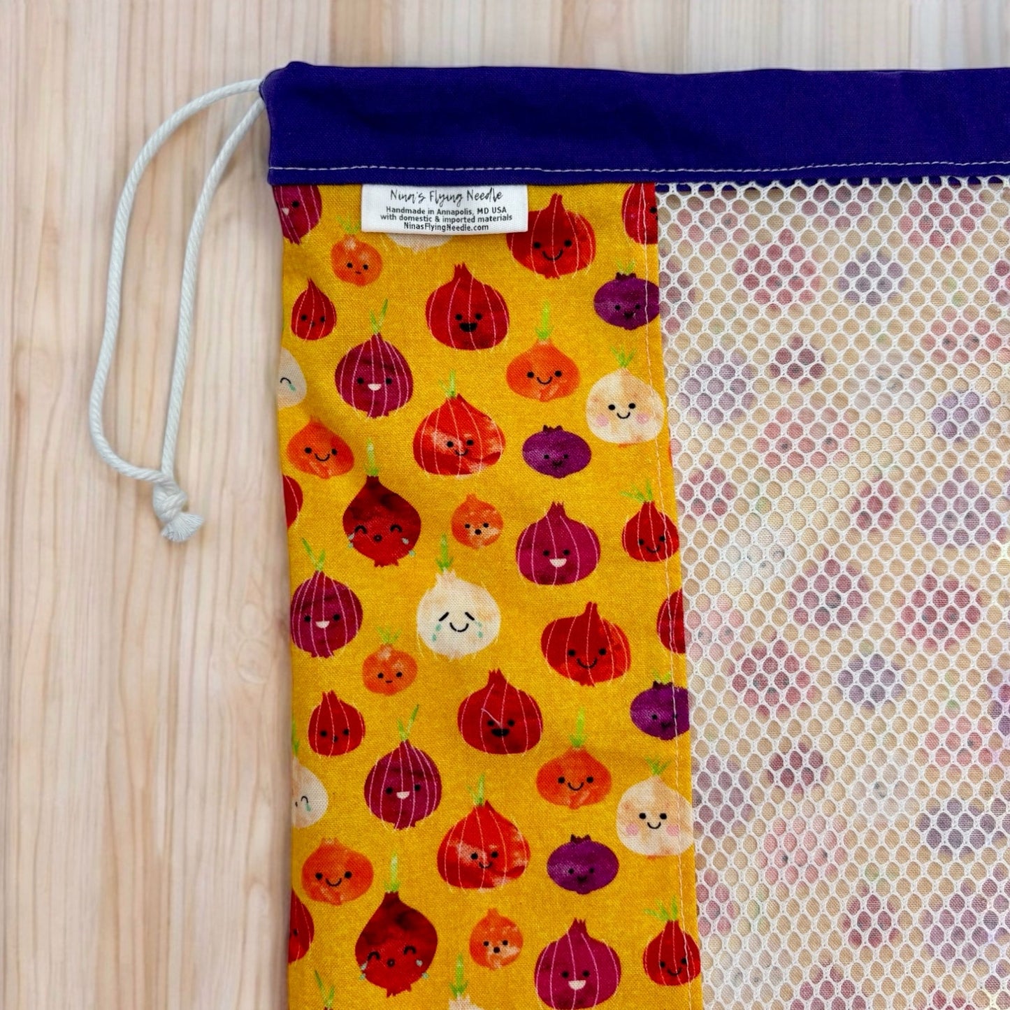 Featuring a design of smiling onions with a solid purple band, this hand-sewn, reusable produce bag is perfect for larger, bulkier items like celery, romaine lettuce, corn, and bananas. Measuring 18 x 12.5 inches (or even 13.5 inches), it is larger than the standard grocery plastic produce bag and includes a convenient drawstring closure. The attached tag displays the bag's tare weight for easy checkout. Made from food-safe materials free of toxins, this bag is easy to care for with machine wash and cool dry/iron as needed.