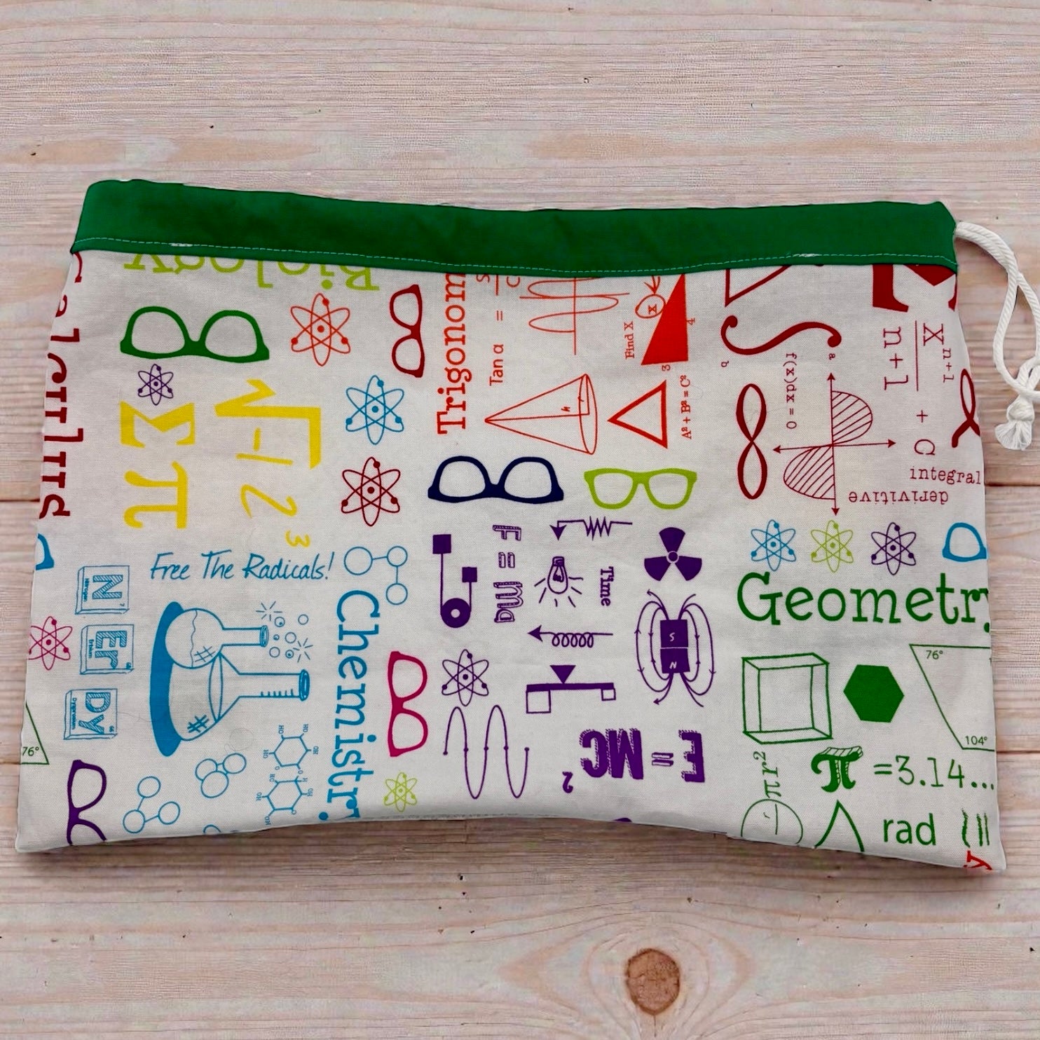 Reduce your plastic waste with our Medium Produce Bag. This reusable bag features a science and math print with a solid green band and useful drawstring closure. Its versatile size can accommodate bulkier produce items, such as oranges, apples, potatoes, and more. Made with care using science and math formulas, this bag is also food safe and machine washable.