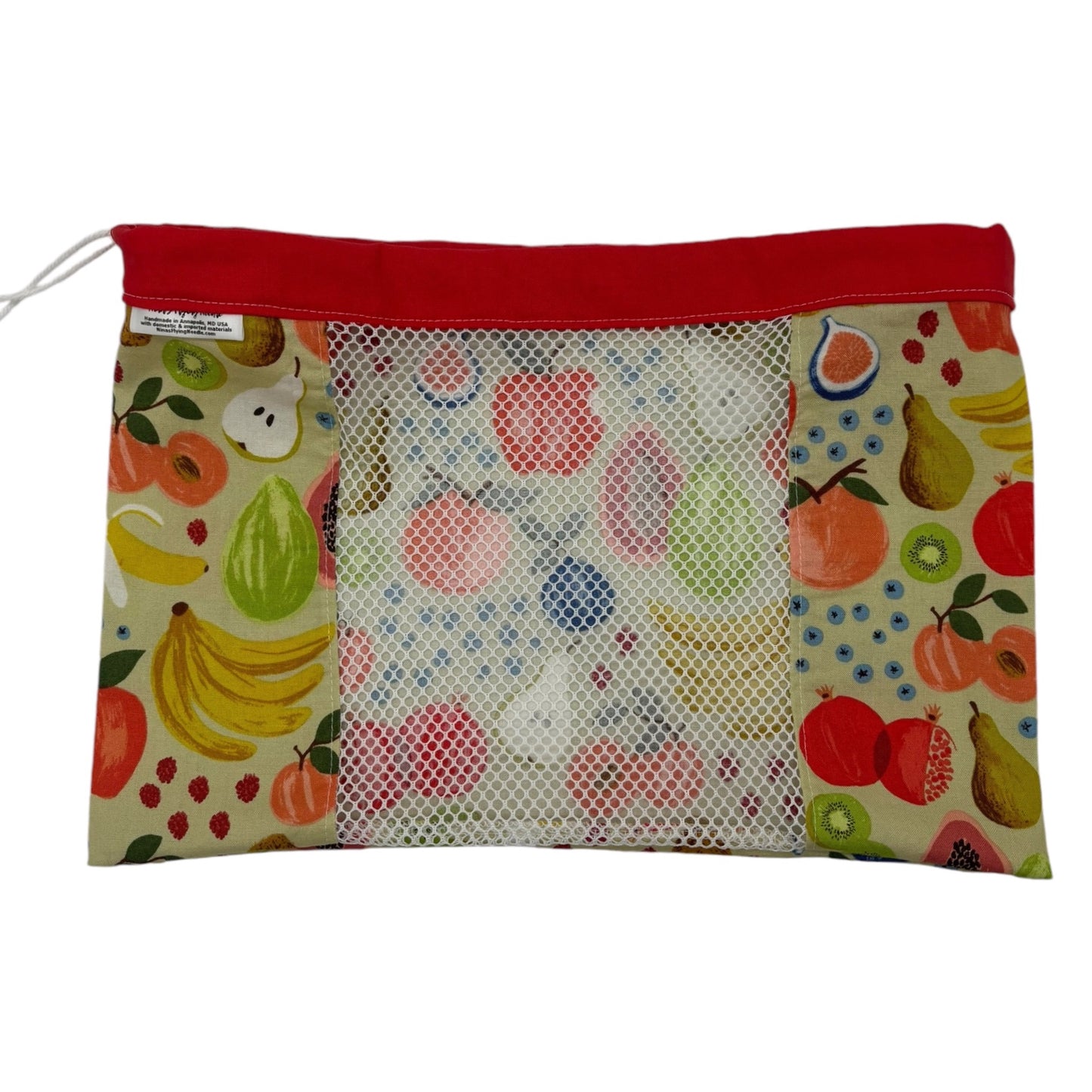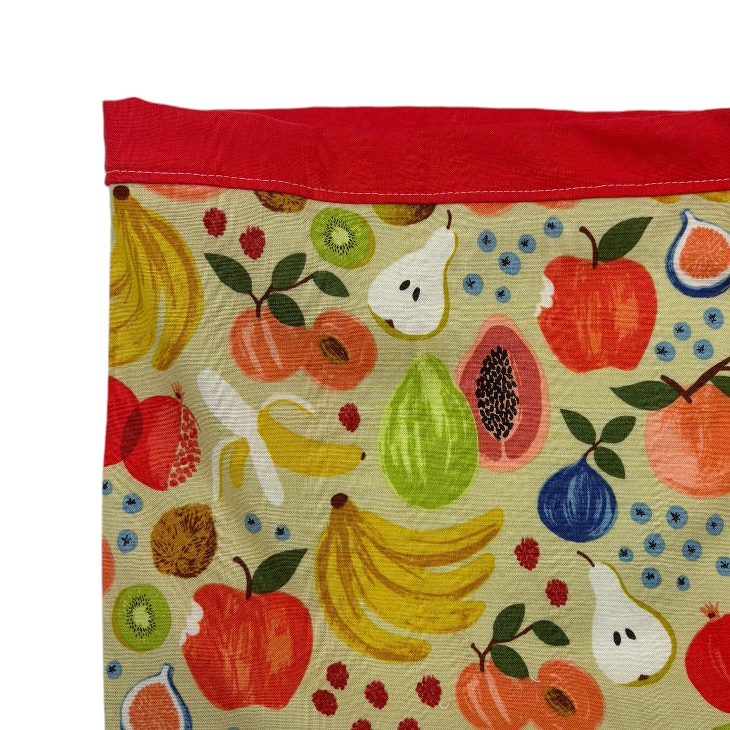 Expertly crafted to be versatile and sustainable, this hand-sewn produce bag features a whimsical fruit design with a solid red band. Designed for larger produce items like oranges, apples, and potatoes, as well as fruits and vegetables such as peppers, carrots, cucumbers, lettuce, and grapes, this medium-sized bag measures 13 x 9.5 inches. With a convenient drawstring closure and a tag that lists the bag's tare weight for easy checkout, this bag is also food safe and free of harmful toxins. Simply machine wash on a cool setting and hang dry or iron as needed for long-lasting use.
