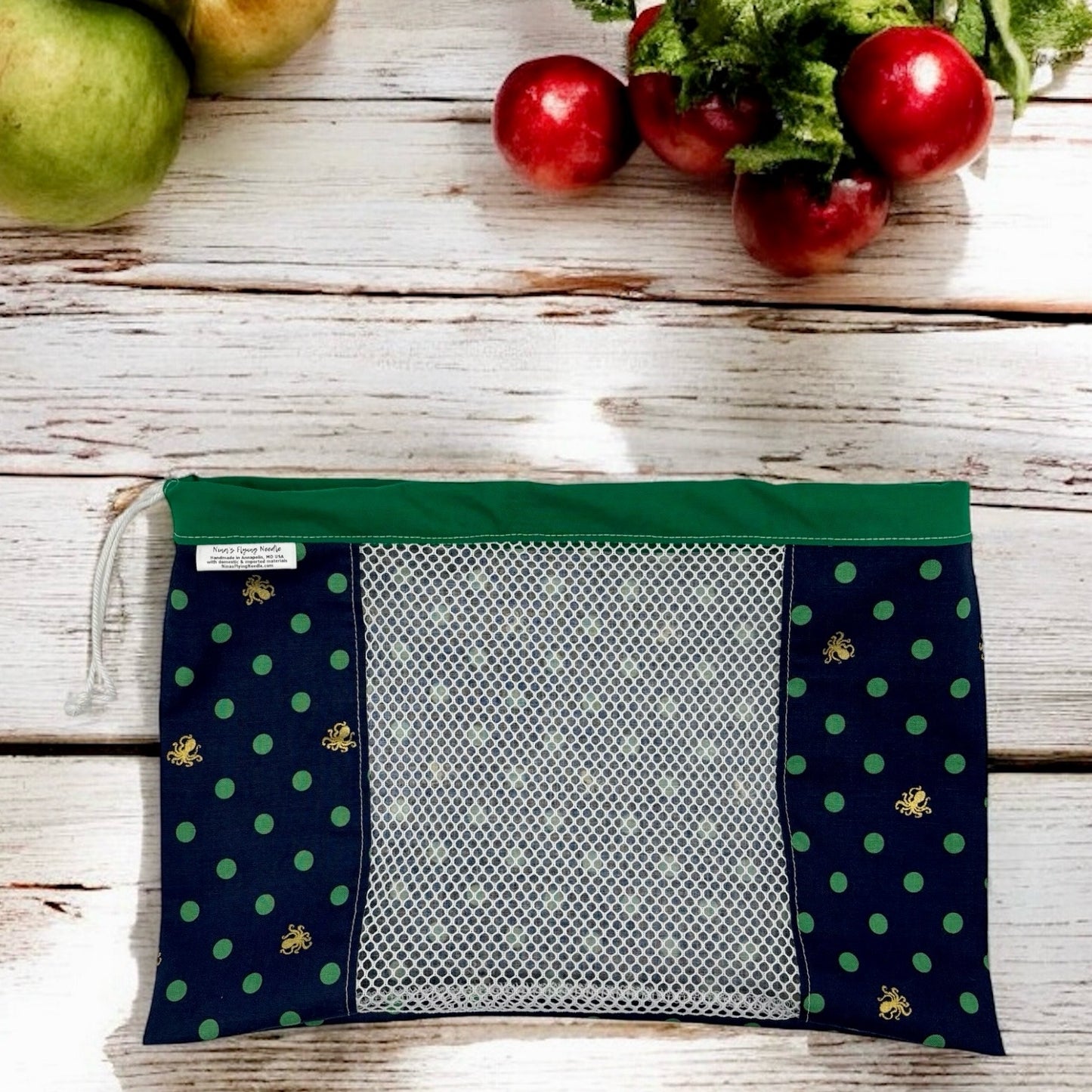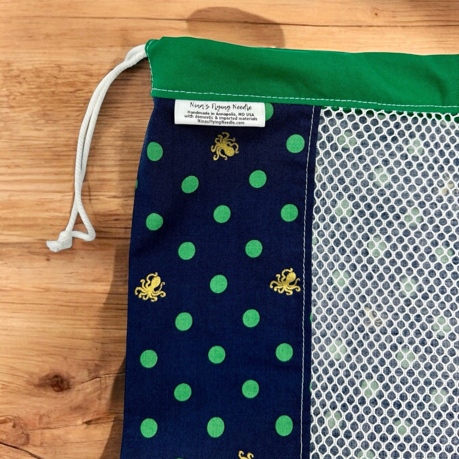 Expertly crafted to be versatile and sustainable, this hand-sewn produce bag features a design with golden octopus and green polka dots on navy with a solid green band. Designed for larger produce items like oranges, apples, and potatoes, as well as fruits and vegetables such as peppers, carrots, cucumbers, lettuce, and grapes, this medium-sized bag measures 13 x 9.5 inches. With a convenient drawstring closure and a tag that lists the bag's tare weight for easy checkout, this bag is also food safe and free of harmful toxins. Simply machine wash on a cool setting and hang dry or iron as needed for long-lasting use.