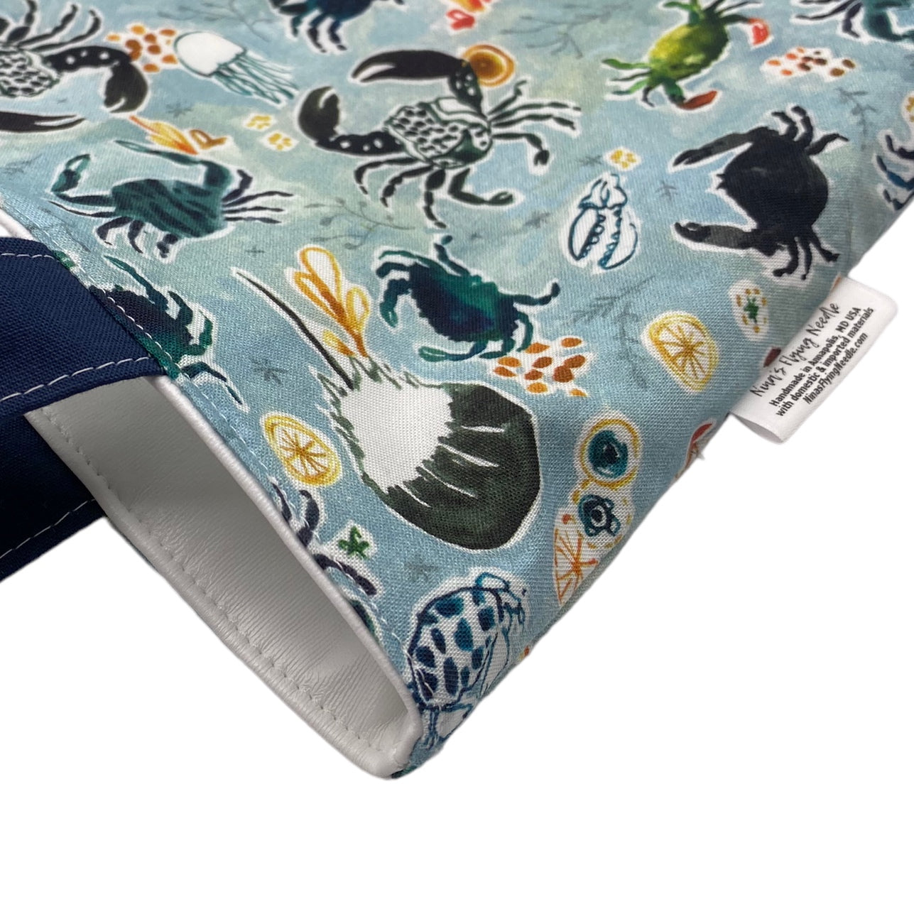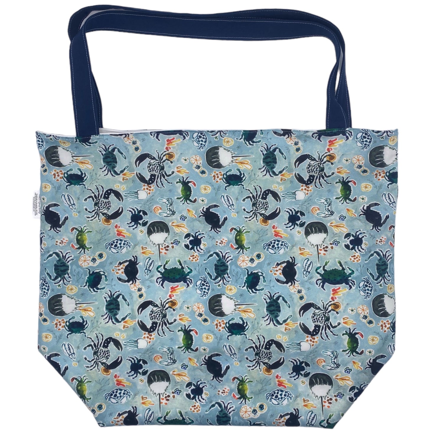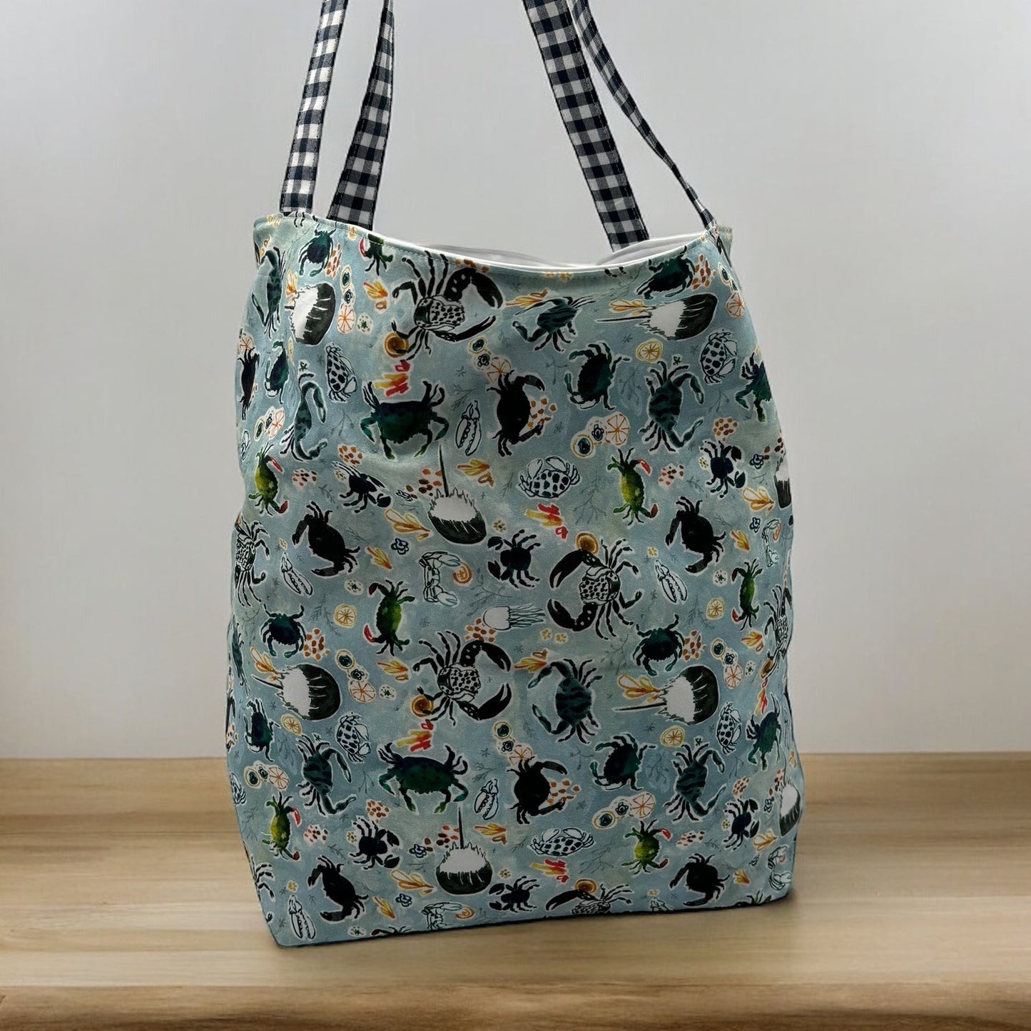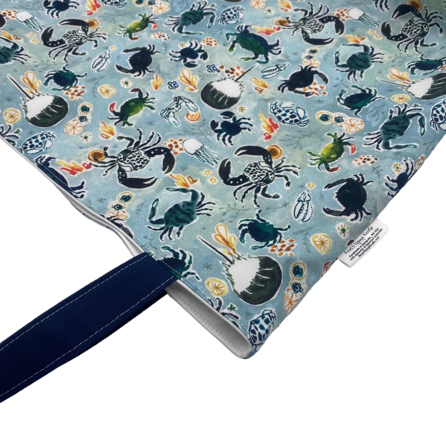 Expertly designed with navy blue and white gingham handles, this Pool Bag features a Crabs design and is the perfect addition to your beach or pool day. Measuring 17.5 x 16 x 6.5 inches, they are fully lined with water resistant material and can easily be washed and folded for convenient storage. For cleaning, simply turn the bag inside out and wipe clean, or for tougher stains, wash on cold and line dry. Carry all your family's essentials in style with this versatile and practical bag.