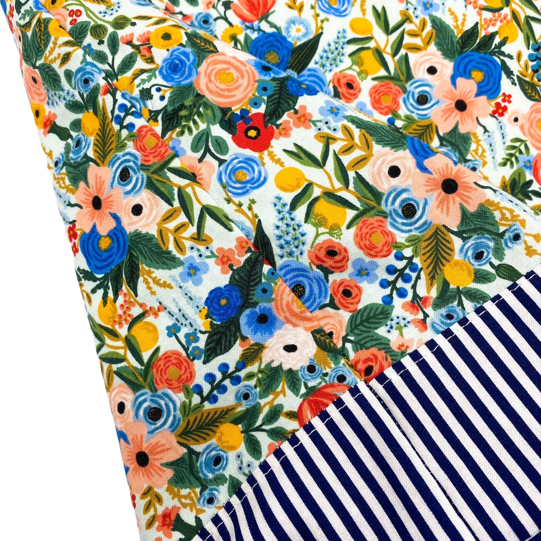 Expertly crafted, this Pool Bag features a Rifle Co. Floral design with a navy and white striped bottom and navy blue woven cotton handle. With a water-resistant lining, this bag measures 17.5 x 16 x 6.5 inches and can easily be cleaned by turning inside out and wiping clean or machine washing on cold and line drying. Perfect for the pool or beach, this bag is fully washable and can be folded down neatly for convenient storage. It's ideal for carrying towels, bathing suits, and all family essentials.