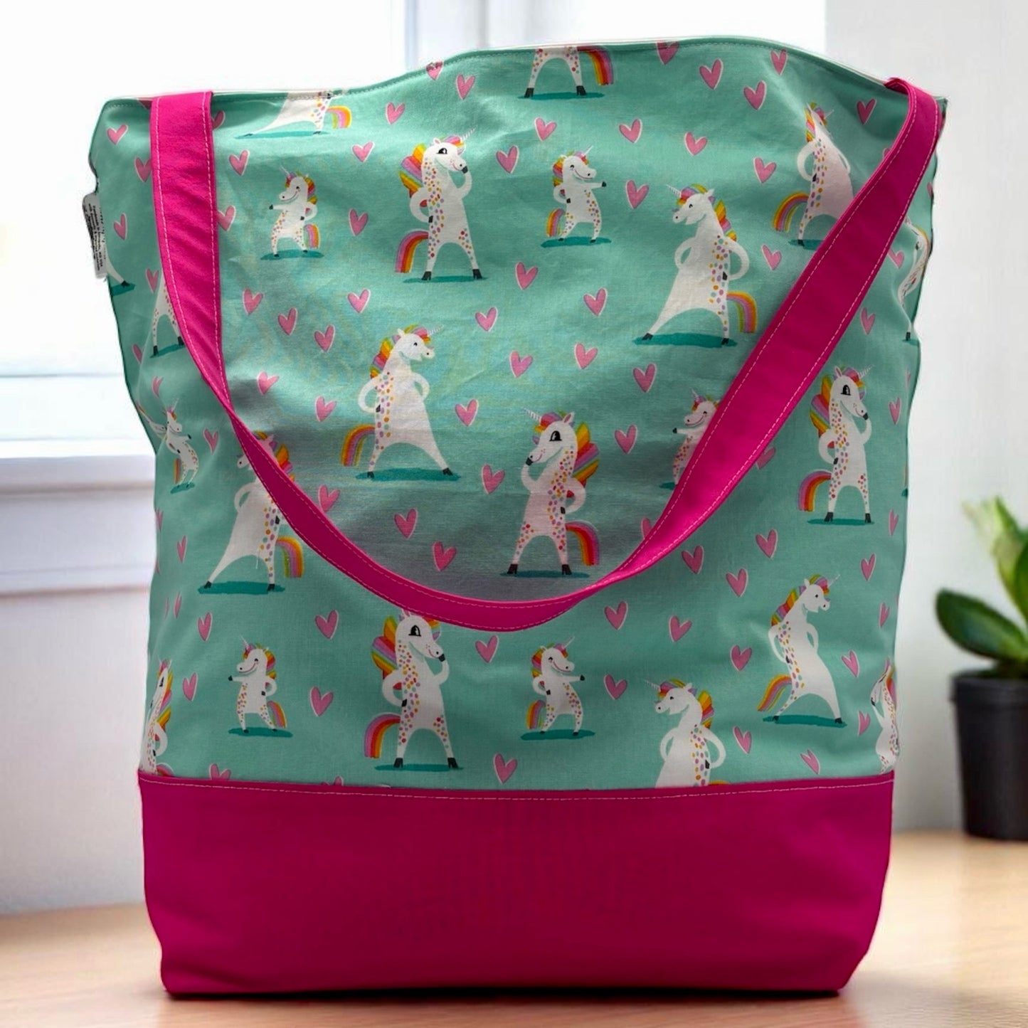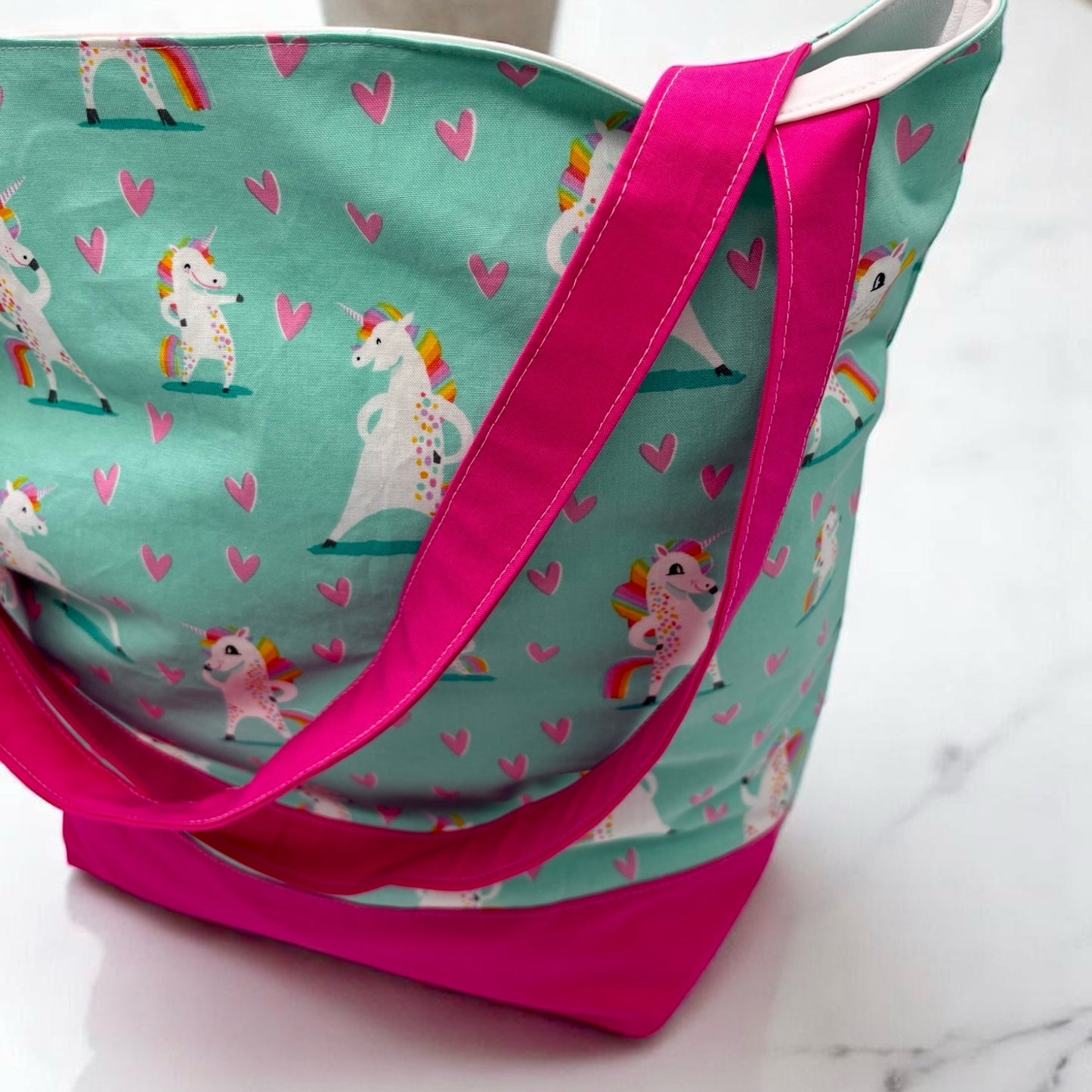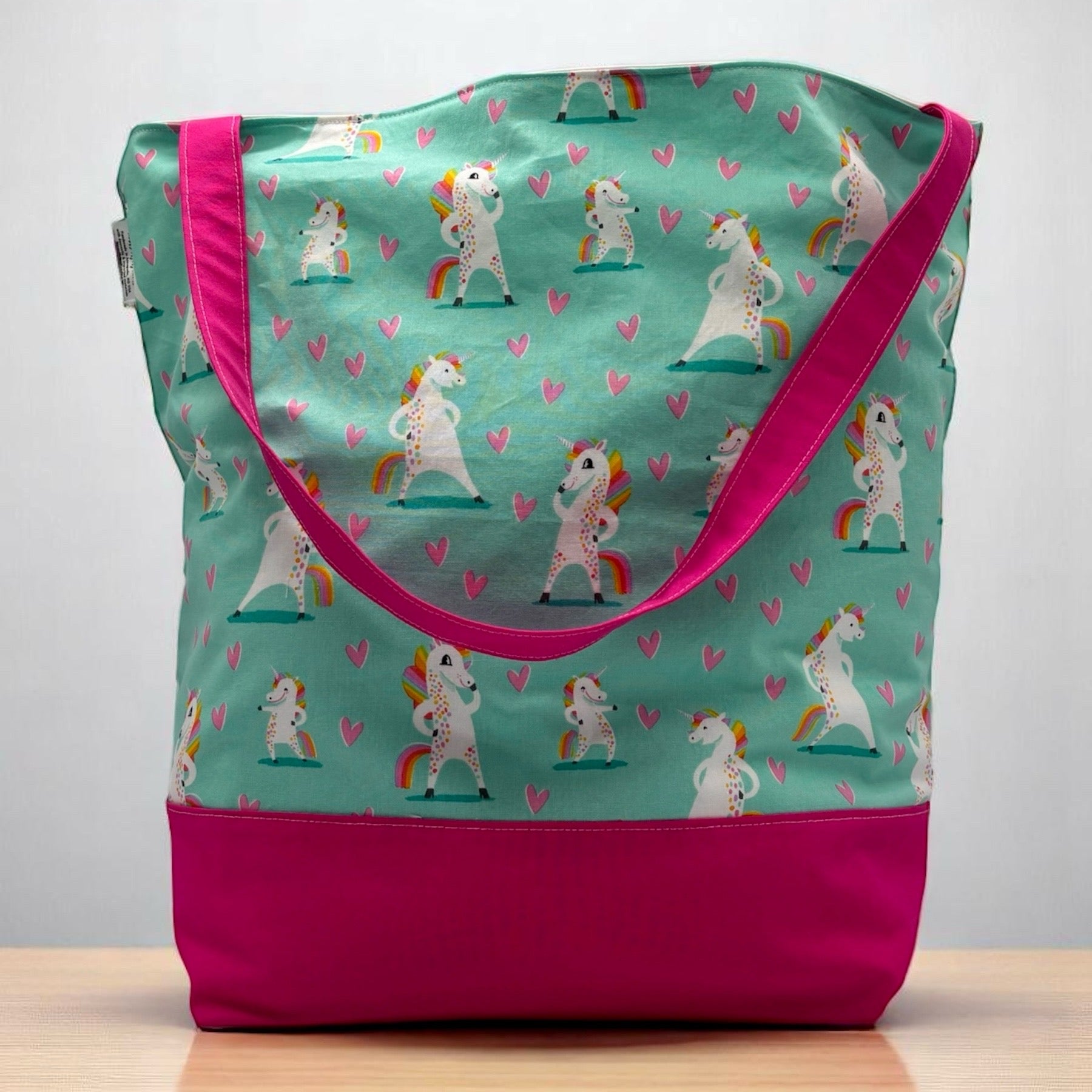 Expertly designed with a unicorn/rainbow and solid pink print combo, this Pool Bag is the perfect addition to your beach or pool day. Measuring 17.5 x 16 x 6.5 inches, they are fully lined with water resistant material and can easily be washed and folded for convenient storage. For cleaning, simply turn the bag inside out and wipe clean, or for tougher stains, wash on cold and line dry. Carry all your family's essentials in style with this versatile and practical bag.