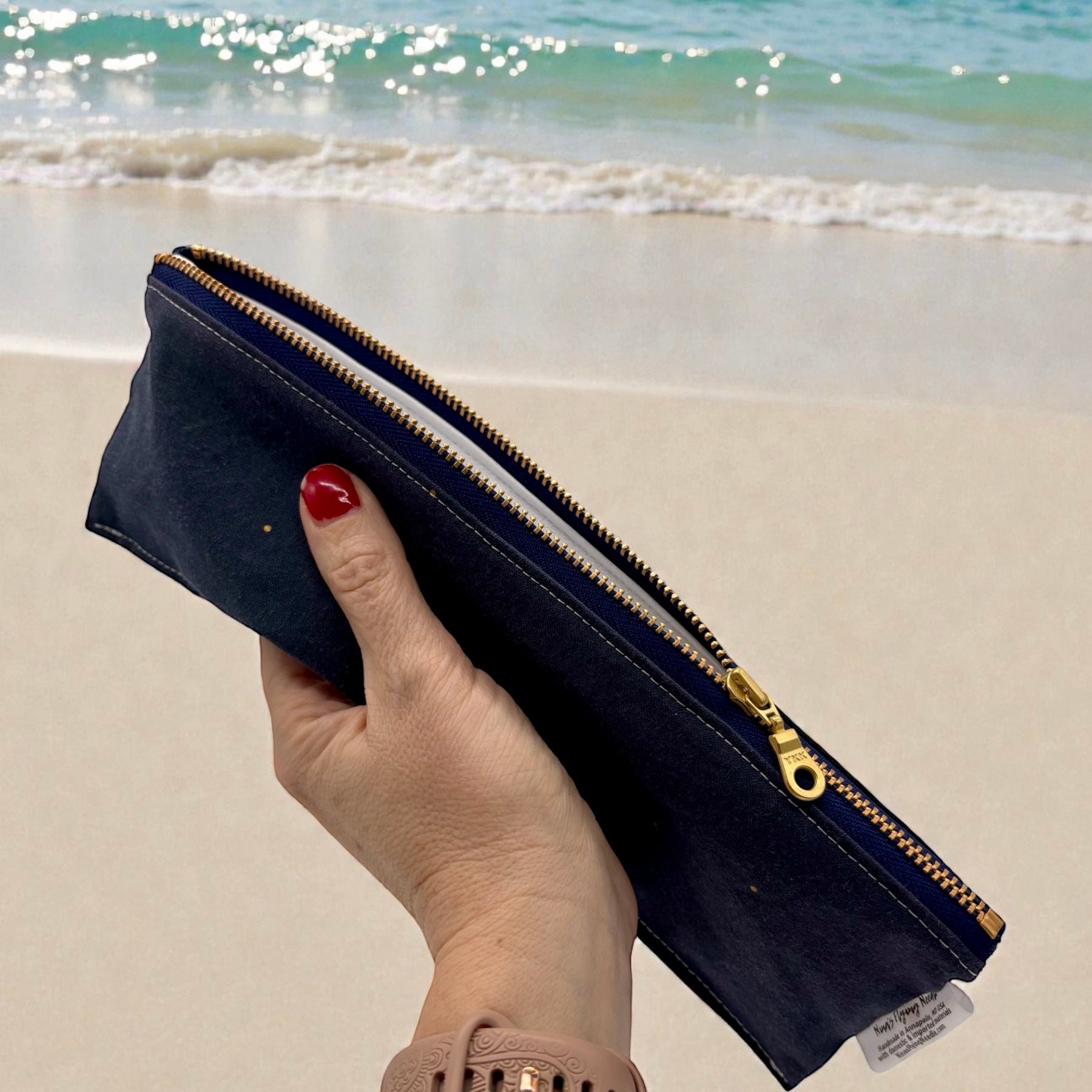 Regular Sized Reusable Straw/Utensil Wet Bag Dots on Navy with Metal Zipper