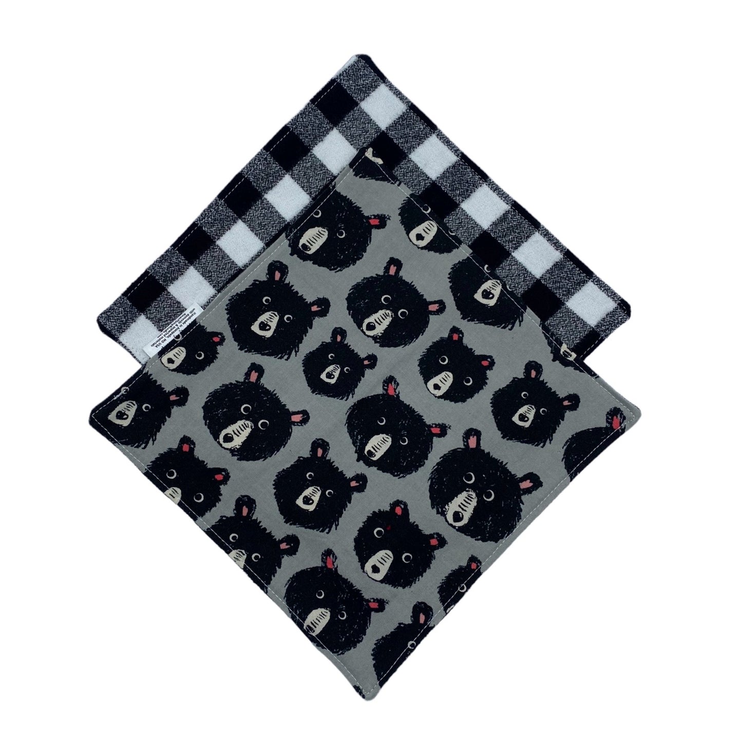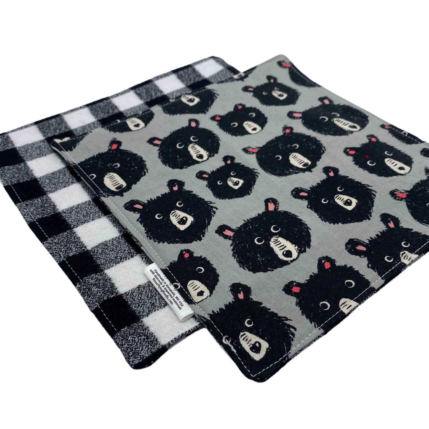 - 100% cotton of bears on gray and black and white gingham flannel on the opposite side
