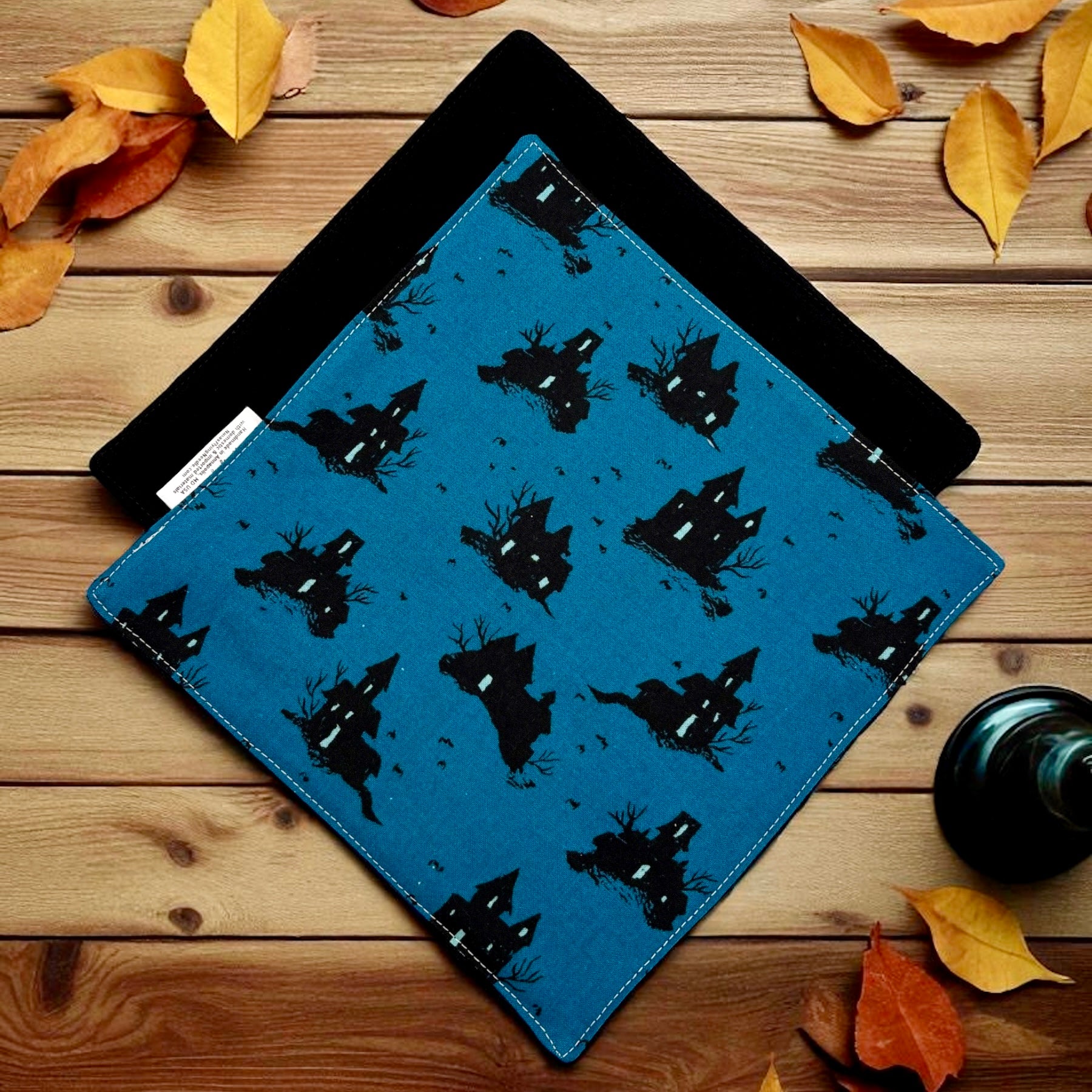 Crafted from 100% cotton, these hand-sewn, reusable napkins feature a haunted house print on one side and a solid black flannel print on the other side. Measuring 8 x 8 inches, they are perfect for any occasion, whether it be lunch or dinner. Their durable material makes them easy for children to handle. For best results, machine wash with like colors on warm and tumble dry low. Iron as needed.