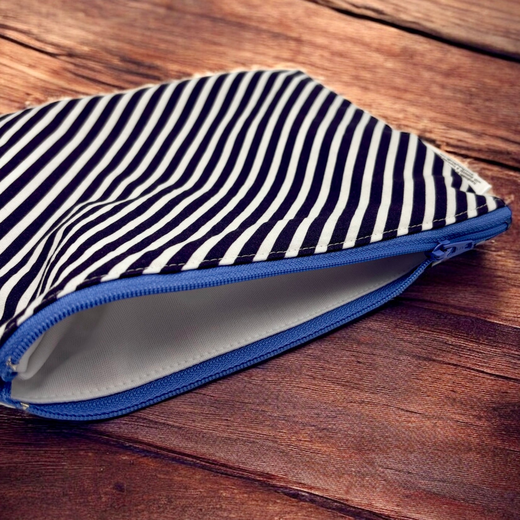 Expertly crafted with a spacious design, this reusable zippered bag features a navy and white bis stripe design with a blue zipper. You’ll be sure to make a statement wherever you go. Use it for a variety of purposes, from storing snacks like popcorn, chips, or veggies and fruit, to keeping all your first aid essentials organized while on the go. Made with food-safe materials and free of toxins, this bag is reliable and easy to clean with a simple turn inside out and wipe or a quick wash in the machine. Both functional and stylish, it's a must-have for any adventurer.