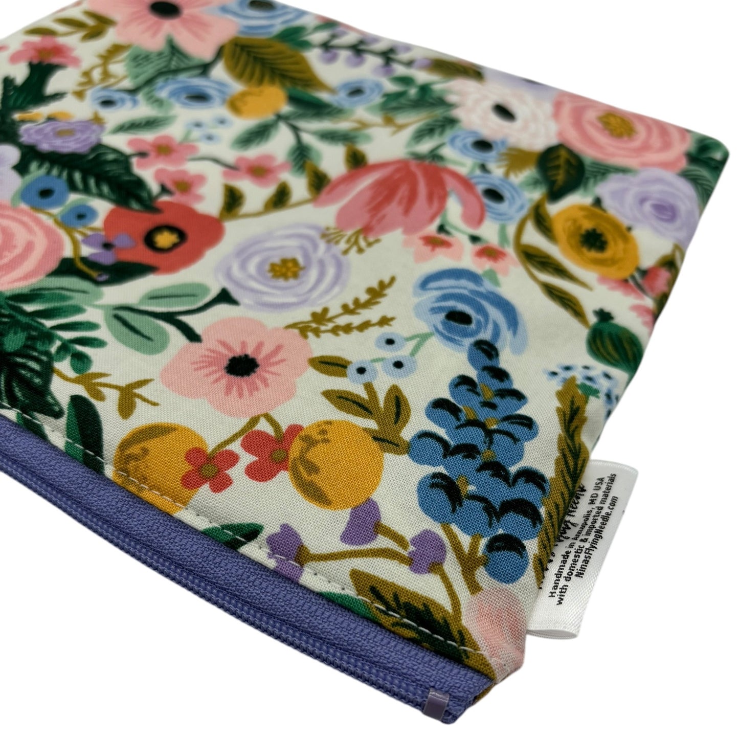 The Sandwich Sized Reusable Zippered Bag features a beautiful Rifle Paper Co floral print in pastel with a lavender zipper. This hand-sewn bag measures approximately 8 x 6.5 inches and is perfect for storing a bagel, sandwich, popcorn, chips, or cut up veggies and fruit. Whether you're on the go, traveling, or need to store first aid items or toys, this bag is the perfect solution. Plus, it's food safe and free of toxins, with easy to handle, quality, and lead free zippers. Simply turn inside out and wipe clean, or toss in the washing machine when needed and hang to dry. Order yours today!