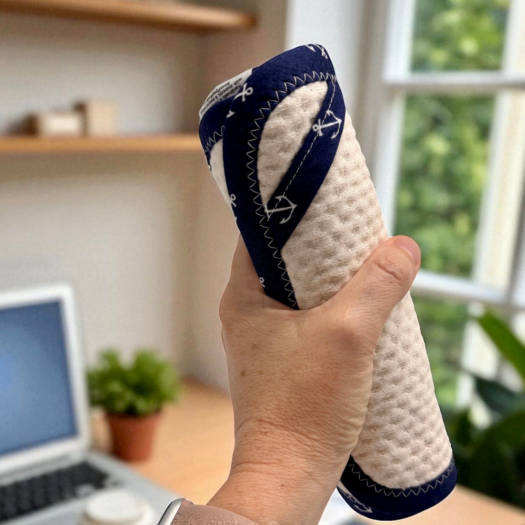 This set of 2 reusable paper towels features a hand-sewn design of anchors on navy, complete with identical hooks for convenience. Crafted with 100% organic cotton, this fabric is US manufactured and boasts organic antimicrobial properties. Additionally, these towels are BPA-free, hypoallergenic, and both durable and absorbent. Measuring at 12 x 7.5 inches, they also come with a convenient hook for effortless storage or drying.