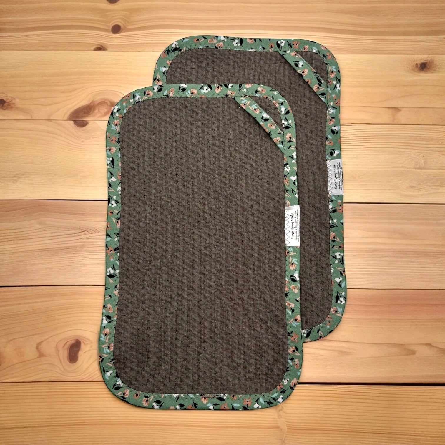 This set of 2 reusable paper towels features a hand-sewn design of a green floral print on dark gray, complete with a matching hook for convenience. Crafted with 100% organic cotton, this fabric is US manufactured and boasts organic antimicrobial properties. Additionally, these towels are BPA-free, hypoallergenic, and both durable and absorbent. Measuring at 12 x 7.5 inches, they also come with a convenient hook for effortless storage or drying.