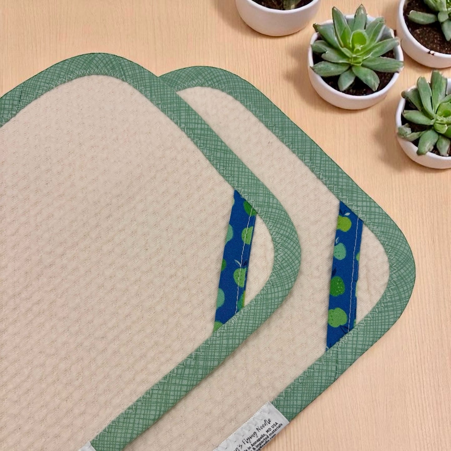 This set of 2 reusable paper towels features a hand-sewn design of a green pattern print, complete with an apple patterned hook for convenience. Crafted with 100% organic cotton, this fabric is US manufactured and boasts organic antimicrobial properties. Additionally, these towels are BPA-free, hypoallergenic, and both durable and absorbent. Measuring at 12 x 7.5 inches, they also come with a convenient hook for effortless storage or drying.