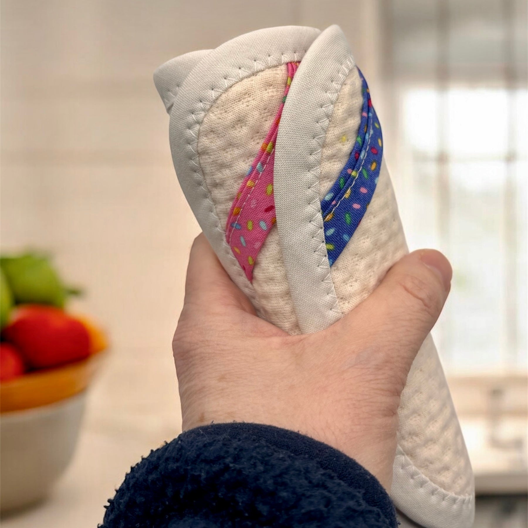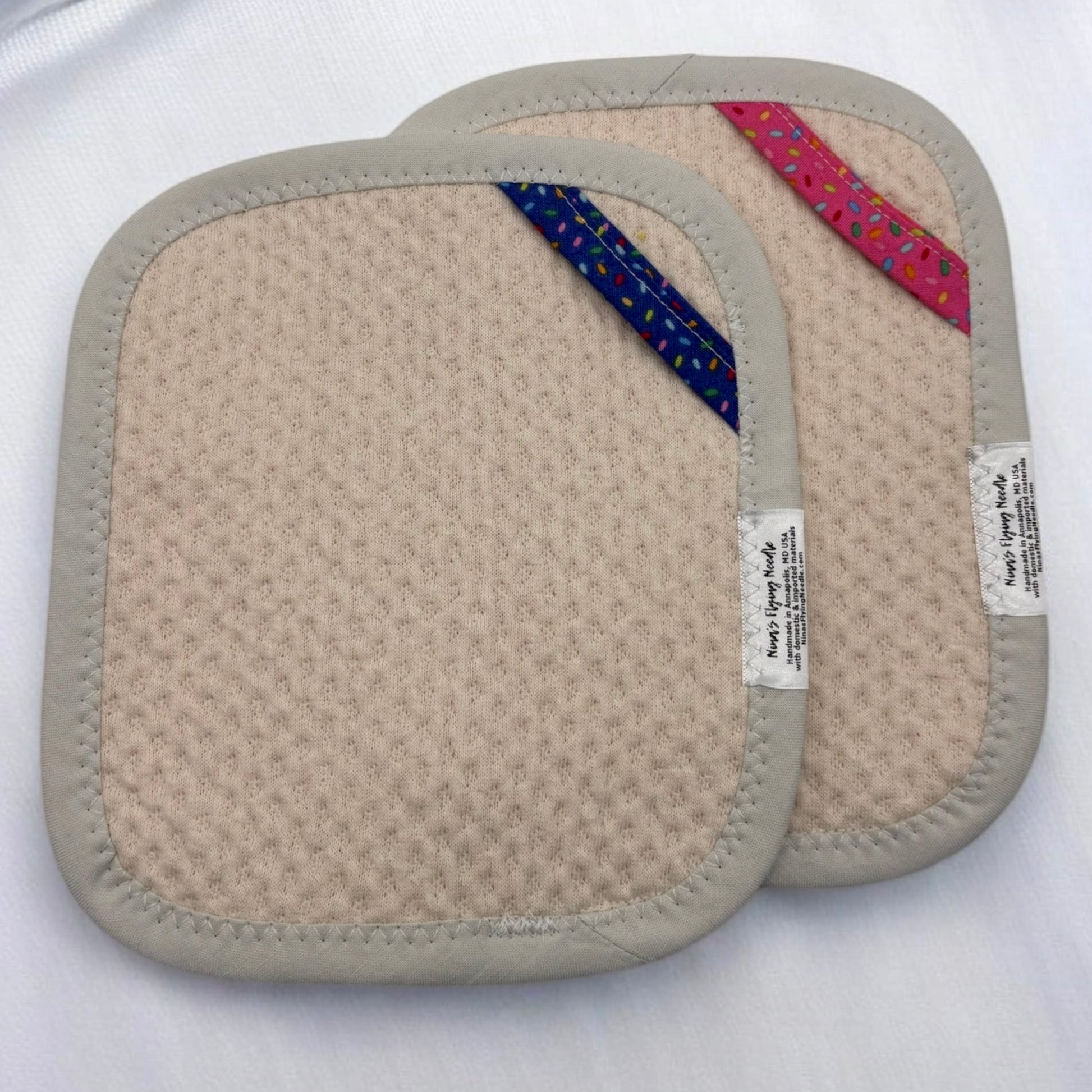 Crafted by hand, this set of 2 reusable paper towels boasts a petite size and an off white print with a confetti on blue and one on pink hook. Made from 100% organic cotton, these towels are also BPA-free, hypo-allergenic, and feature antimicrobial properties. With a durable and absorbent construction, they measure 6 x 7.5 inches and include a convenient hook for effortless storage and drying. Proudly crafted with US manufactured fabric.