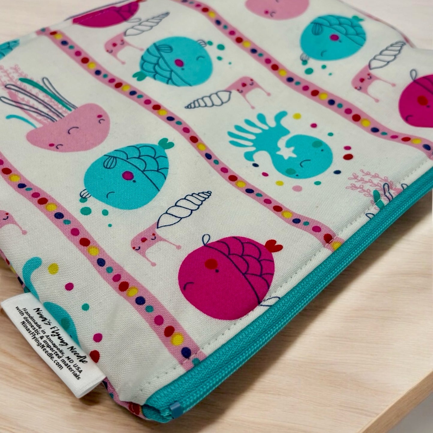 The small sized wet bag features a whimsical fish design with a teal zipper, measuring 8 x 6.5 inches. This waterproof bag is a must-have for keeping your valuables safe at the pool or beach, including keys, phone, and sunglasses. It can also serve as a great makeup bag. When traveling, it is perfect for packing delicates or shower essentials. Cleaning is easy - simply turn the bag inside out and wipe clean. If necessary, it can be machine washed on a cold setting and should be air-dried.