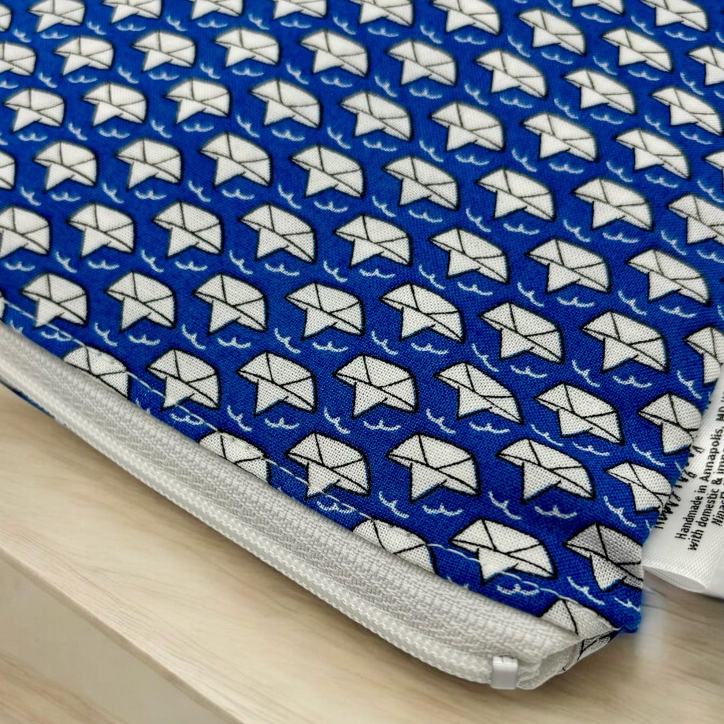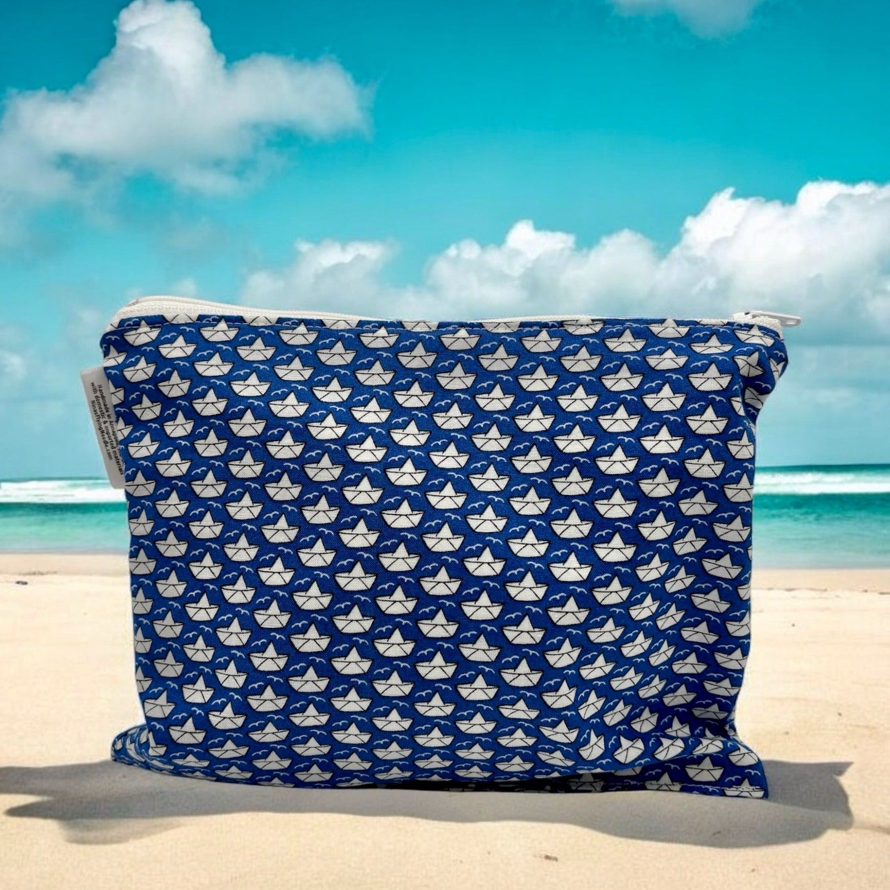 The small sized wet bag features a whimsical paper boat design with a cream white zipper, measuring 8 x 6.5 inches. This waterproof bag is a must-have for keeping your valuables safe at the pool or beach, including keys, phone, and sunglasses. It can also serve as a great makeup bag. When traveling, it is perfect for packing delicates or shower essentials. Cleaning is easy - simply turn the bag inside out and wipe clean. If necessary, it can be machine washed on a cold setting and should be air-dried.