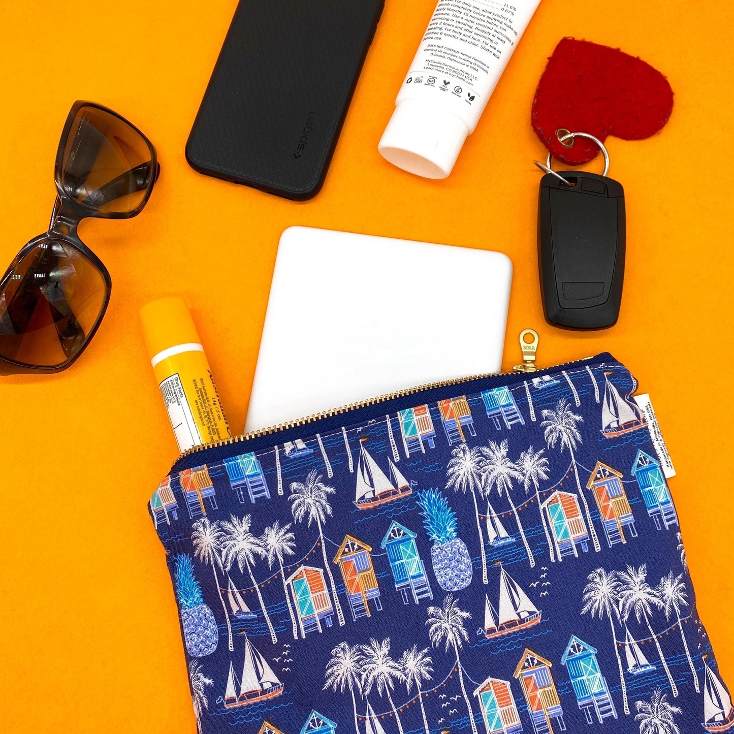 The small sized wet bag features a sailboat print on blue with a white zipper, measuring 8 x 6.5 inches. This waterproof bag is a must-have for keeping your valuables safe at the pool or beach, including keys, phone, and sunglasses. It can also serve as a great makeup bag. When traveling, it is perfect for packing delicates or shower essentials. Cleaning is easy - simply turn the bag inside out and wipe clean. If necessary, it can be machine washed on a cold setting and should be air-dried.
