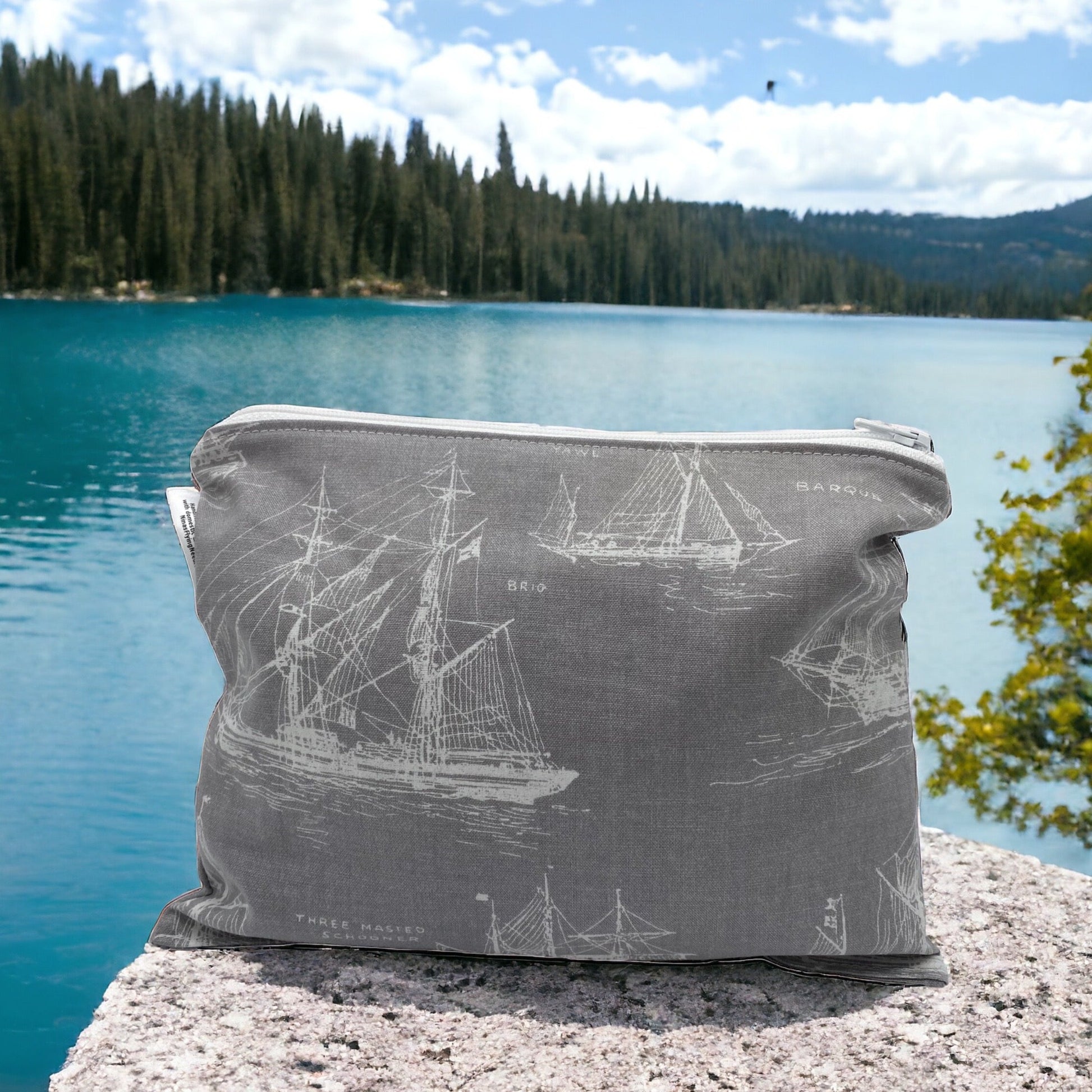 - Schooner sailing vessel on gray with a white zipper