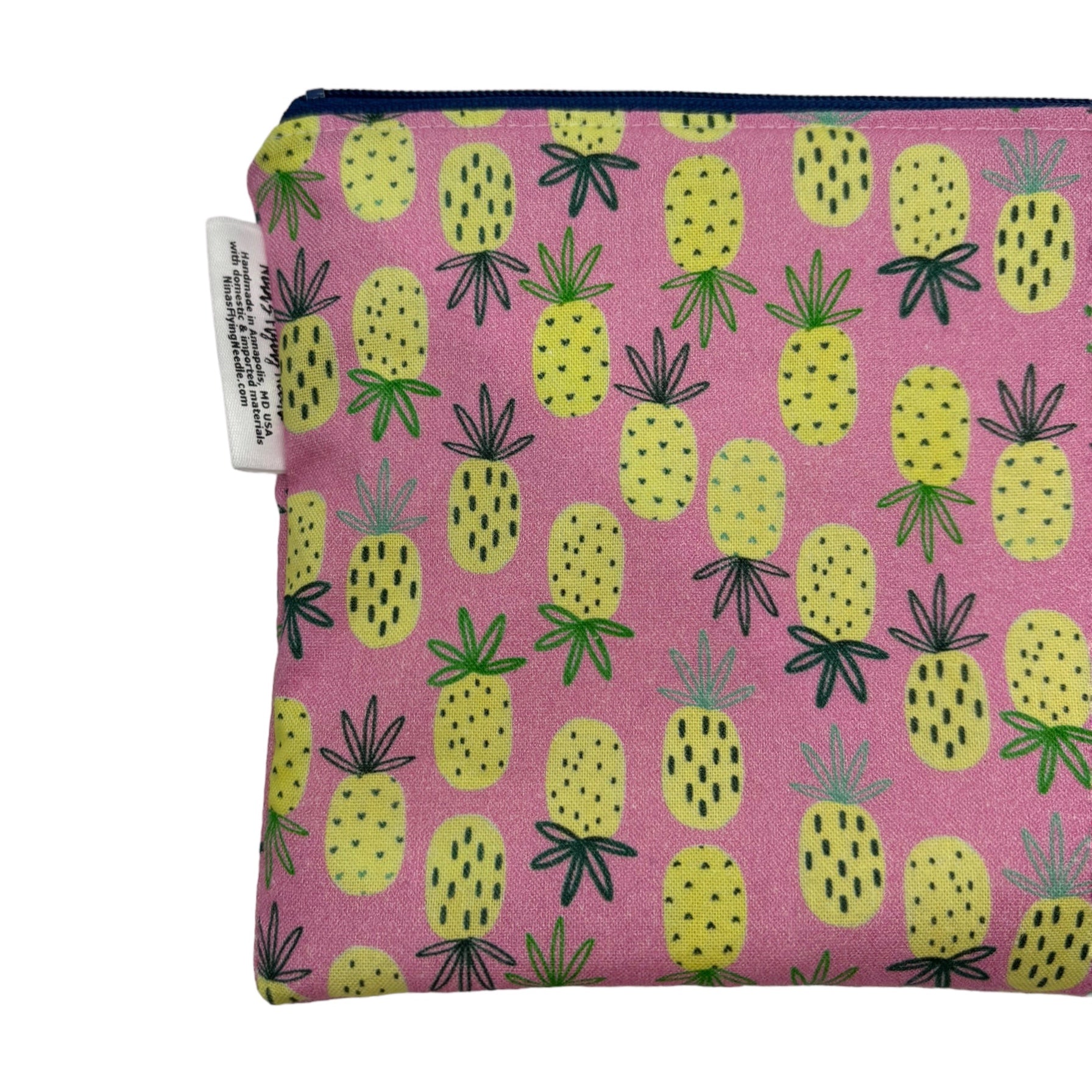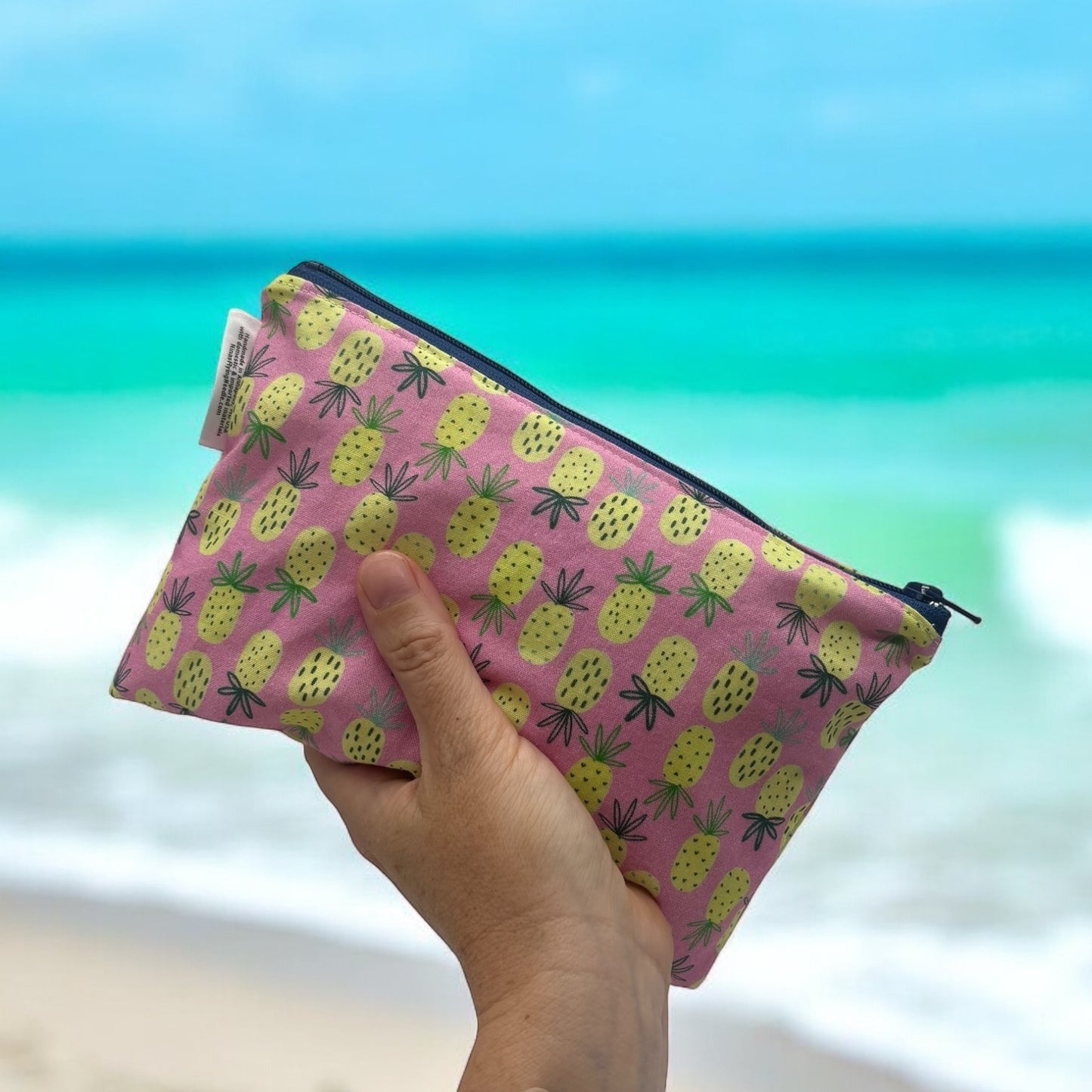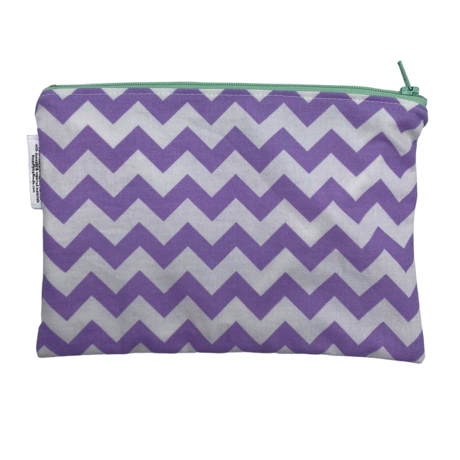 The reusable snack-sized bag features a castle design on pink with a purple zipper. This versatile bag, measuring 8 x 5 inches, is perfect for school snacks, traveling, car rides, and lunches. It can also double as a pencil or small toy carrier. Made with high-quality materials, including food-safe and toxin-free components, and equipped with lead-free zippers, this bag is easy to handle and can be washed in the washing machine as needed. Simply turn it inside out and wipe it clean, then hang it to dry.