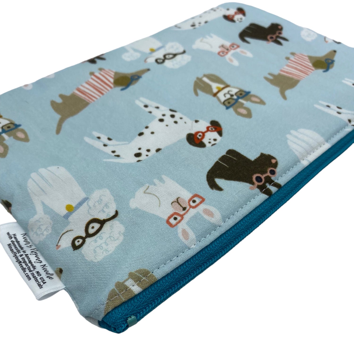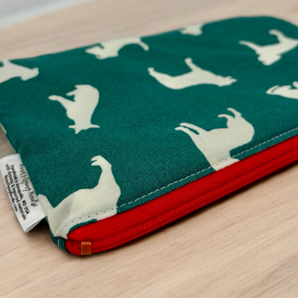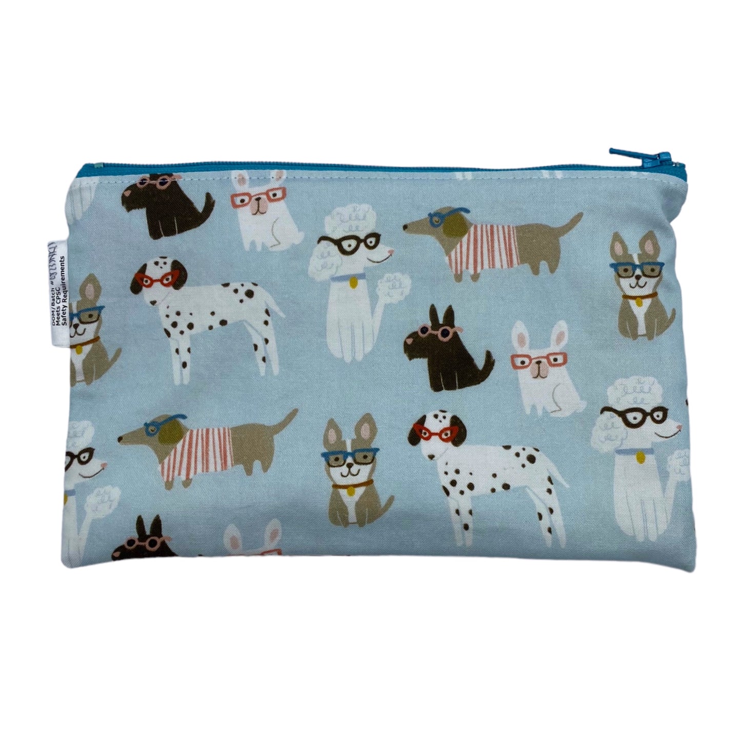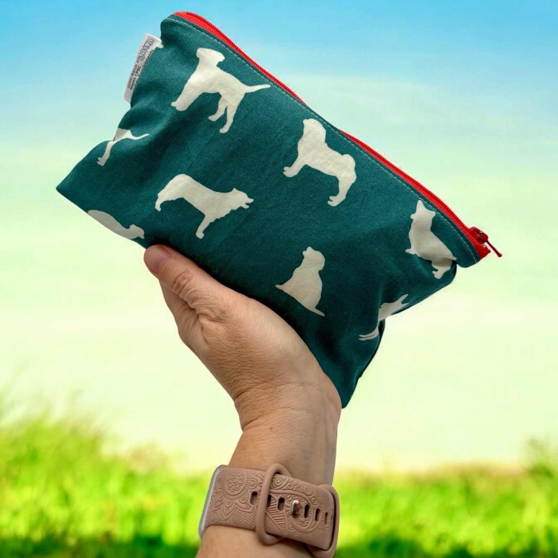 This hand-crafted zippered bag features a whimsical flamingo design against a blue background, with a pink zipper. Please note that shade of pink may differ. Measuring approximately 8 x 5 inches, it is perfectly snack-sized and ideal for packing your child's school snacks, for travel, car rides, or lunches. Not only functional for food, it can also carry small items like pencils, crayons, or toys. Rest assured, this bag is food safe and free of toxins. The high-quality, lead-free zippers make it easy to open and close. For cleaning, simply turn inside out and wipe, or toss in the washing machine and hang to dry.