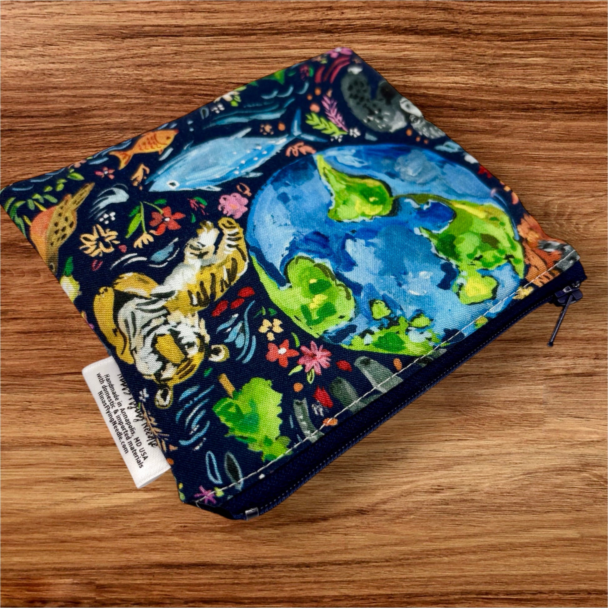 This reusable zippered bag features a planet earth print accented with a blue zipper. It is hand-sewn and designed to be toddler sized, measuring approximately 5.5 x 5 inches. This bag is perfect for packing school snacks, portion control, traveling, car rides, or attaching to a stroller. It also serves a dual purpose as a coin or knick knack carrier in your purse or jacket pocket. Plus, the bag is food safe and free of toxins, with easy-to-use zippers that are made with high-quality and lead-free materials. To clean, simply turn the bag inside out and wipe. For deeper cleaning, you can throw it in the washing machine and then hang it to dry.