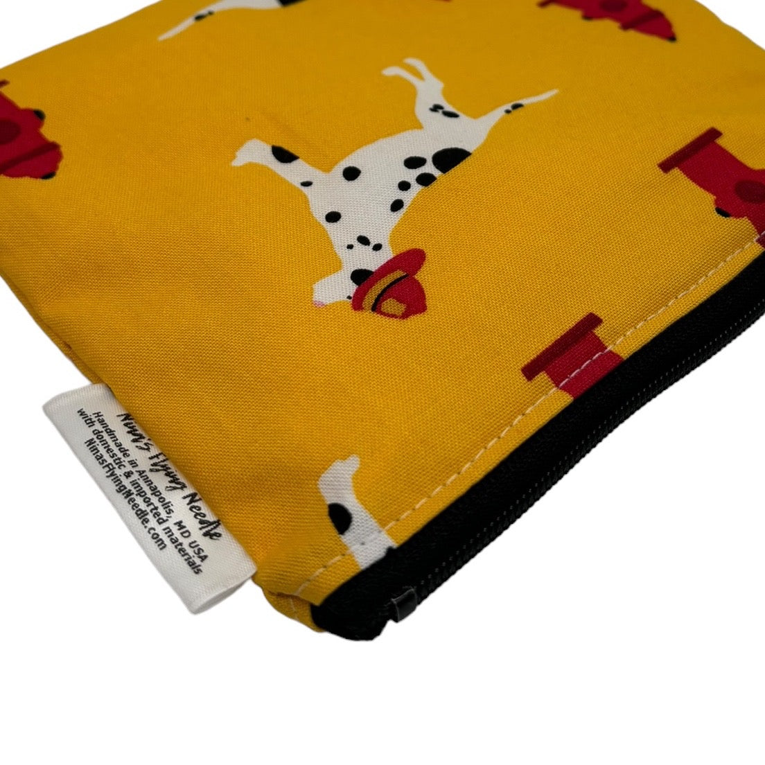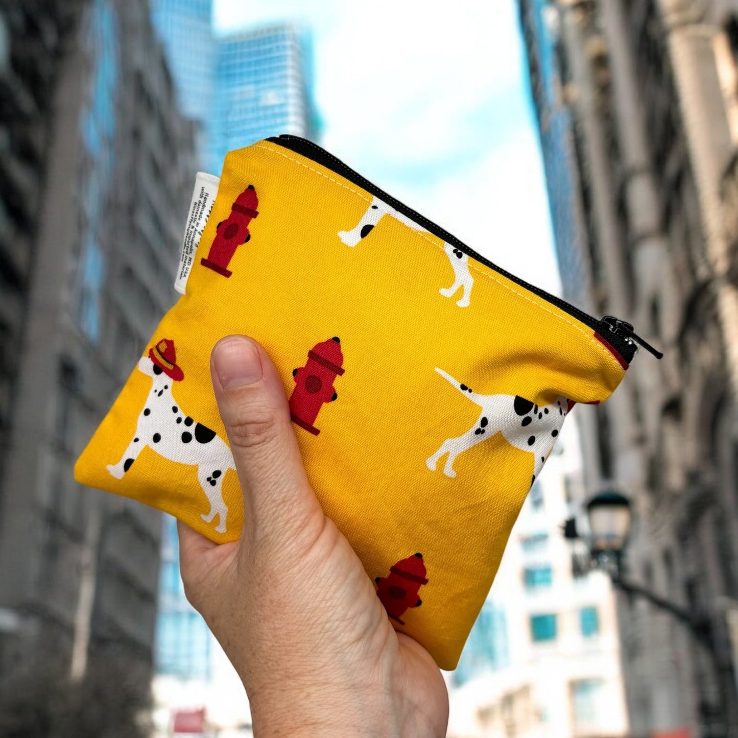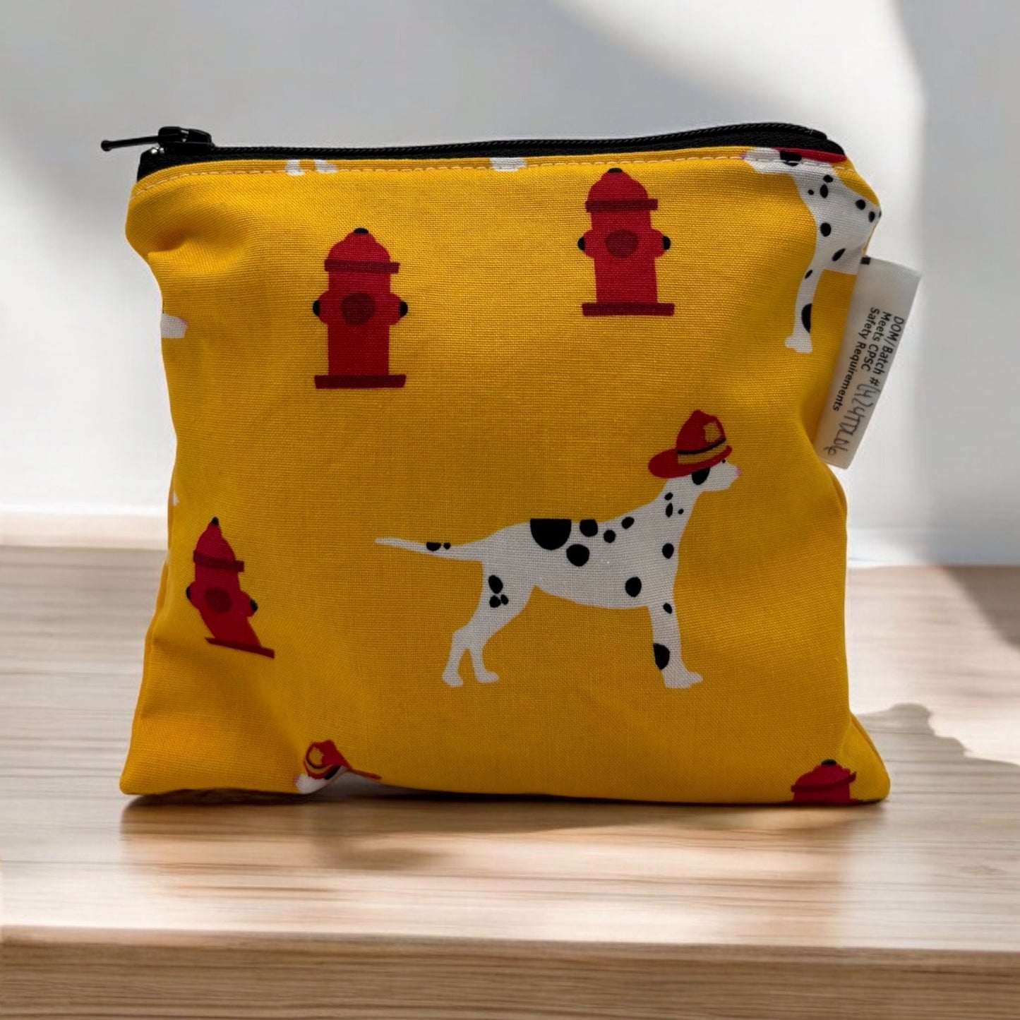 This reusable, zippered bag features a Dalmatian fire dog design with a black zipper. Perfect for toddler-sized portions, it measures approximately 5.5 x 5 inches and can be used for school snacks, traveling, car rides, or stroller outings. It also serves as a convenient way to carry coins or small items in your purse or jacket pocket. The bag is food safe and free of toxins with easy-to-use, high-quality lead-free zippers. Cleaning is a breeze - simply turn inside out and wipe, or throw in the washing machine as needed and hang to dry.