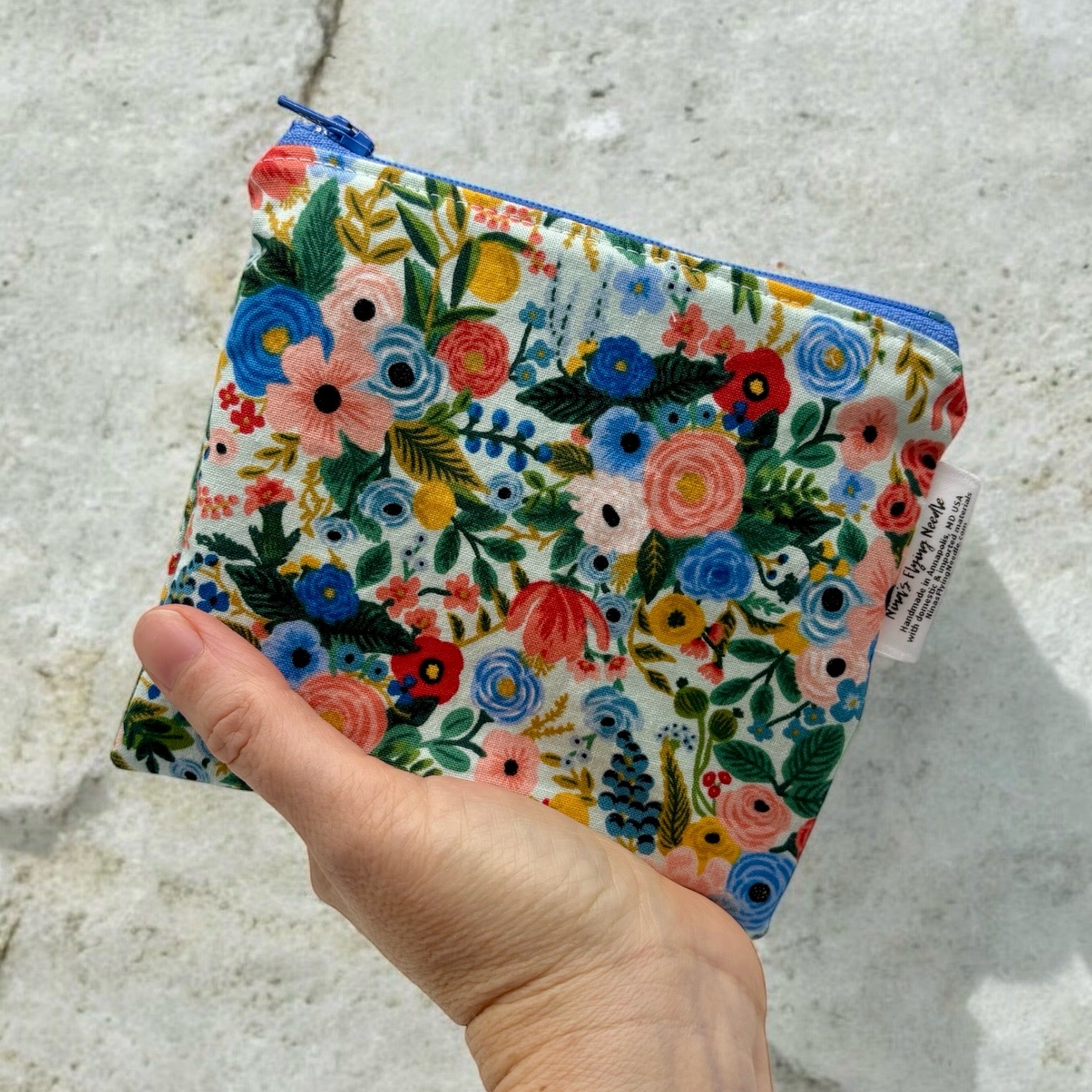 This reusable zippered bag features pirate icons and is accented with a navy zipper. It is hand-sewn and designed to be toddler sized, measuring approximately 5.5 x 5 inches. This bag is perfect for packing school snacks, portion control, traveling, car rides, or attaching to a stroller. It also serves a dual purpose as a coin or knick knack carrier in your purse or jacket pocket. Plus, the bag is food safe and free of toxins, with easy-to-use zippers that are made with high-quality and lead-free materials. To clean, simply turn the bag inside out and wipe. For deeper cleaning, you can throw it in the washing machine and then hang it to dry.