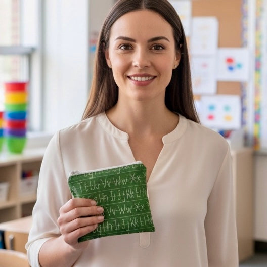 This reusable zippered bag features an ABC print with a white zipper. It is hand-sewn and designed to be toddler sized, measuring approximately 5.5 x 5 inches. This bag is perfect for packing school snacks, portion control, traveling, car rides, or attaching to a stroller. It also serves a dual purpose as a coin or knick knack carrier in your purse or jacket pocket. Plus, the bag is food safe and free of toxins, with easy-to-use zippers that are made with high-quality and lead-free materials. To clean, simply turn the bag inside out and wipe. For deeper cleaning, you can throw it in the washing machine and then hang it to dry.