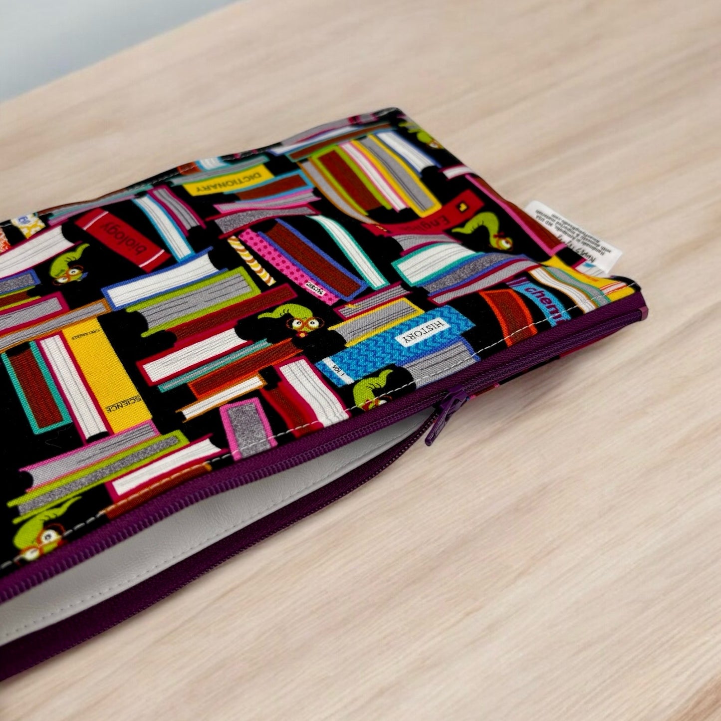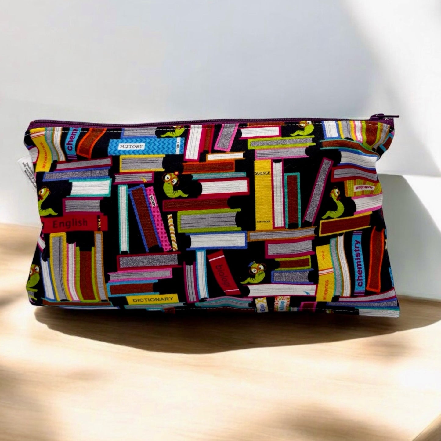 The Travel Sized Wet Bag features a whimsical bookworm print with a secure, purple zipper. Measuring at 10.5 x 6.5 inches, this bag is a reliable storage option for all your travel essentials, including make-up and toiletries. It's also a must-have for your diaper bag, ensuring your diapers and wipes stay dry and leak-free. This versatile bag can also be used for storing swimwear, valuables, delicate items, and shower essentials. You can easily clean it by turning it inside out and wiping it, or machine wash it on cold and air dry.