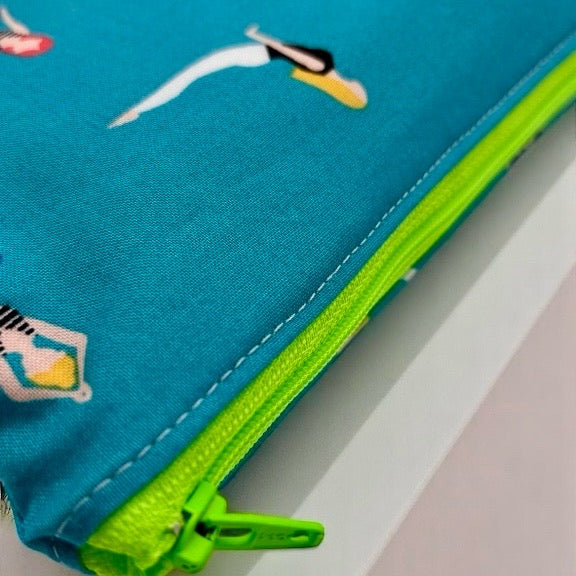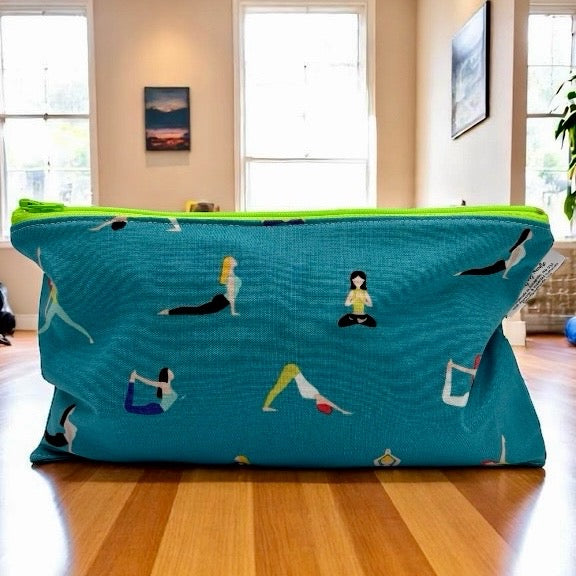 The Travel Sized Wet Bag featuring a whimsical yoga print with a neon green zipper is a must-have for all travelers. Whether you need to carry makeup, toiletries, diapers, wipes, swimwear, valuables, or delicate items, this bag has got you covered. It measures 10.5 x 6.5 inches and features a navy blue gold metal zipper. Keep your belongings safe and dry with this bag's durable construction and secure closure. Plus, it's easy to clean - simply turn it inside out and wipe clean, or wash in the machine on cold and line dry.