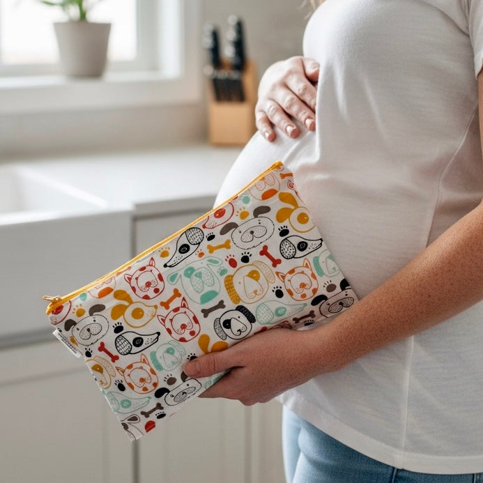 The Travel Sized Wet Bag featuring a colorful dog face print with a yellow zipper is a must-have for all travelers. Whether you need to carry makeup, toiletries, diapers, wipes, swimwear, valuables, or delicate items, this bag has got you covered. It measures 10.5 x 6.5 inches and features a navy blue gold metal zipper. Keep your belongings safe and dry with this bag's durable construction and secure closure. Plus, it's easy to clean - simply turn it inside out and wipe clean, or wash in the machine on cold and line dry.