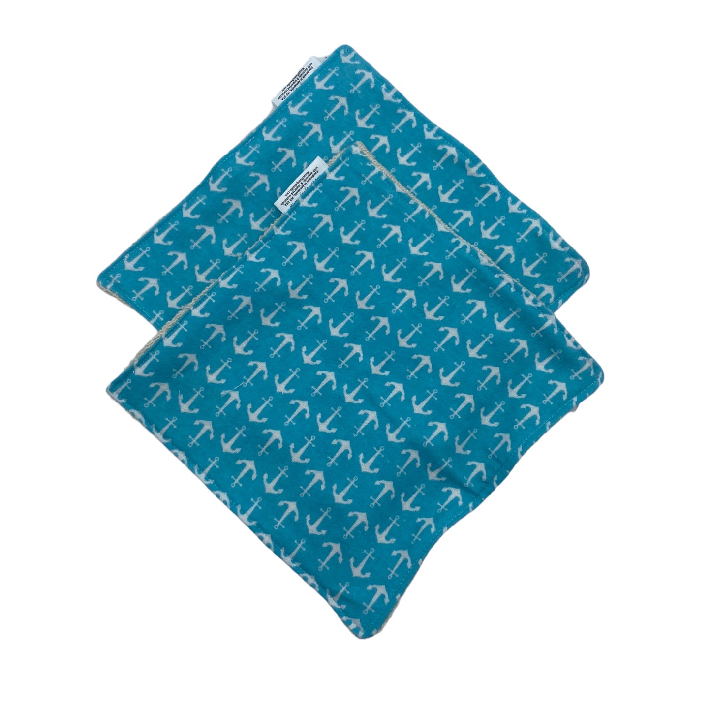Discover the versatility and eco-friendliness of our Wash Cloth - Regular - Anchors. This set of 2 hand-sewn, reusable cloths is made from 100% organic French terry cotton on one side and 100% organic flannel with white anchors on teal on the other side. Measuring 8 x 8 inches, these wash cloths can be used as baby wipes, face wipes, or toddler napkins, eliminating the need for disposable wipes, cotton balls, or facial rounds. The more you wash the flannel material, the more absorbent it becomes. Get maximum usage out of our wash cloths by using them to scrub away messes, apply skincare, cleanse, or remove makeup. They also make an excellent gift for new moms or moms-to-be. To maintain their quality, simply wash in the machine with like colors on warm, then tumble dry low or iron as needed. Upgrade your daily cleaning routine with our Wash Cloth - Regular - Anchors.