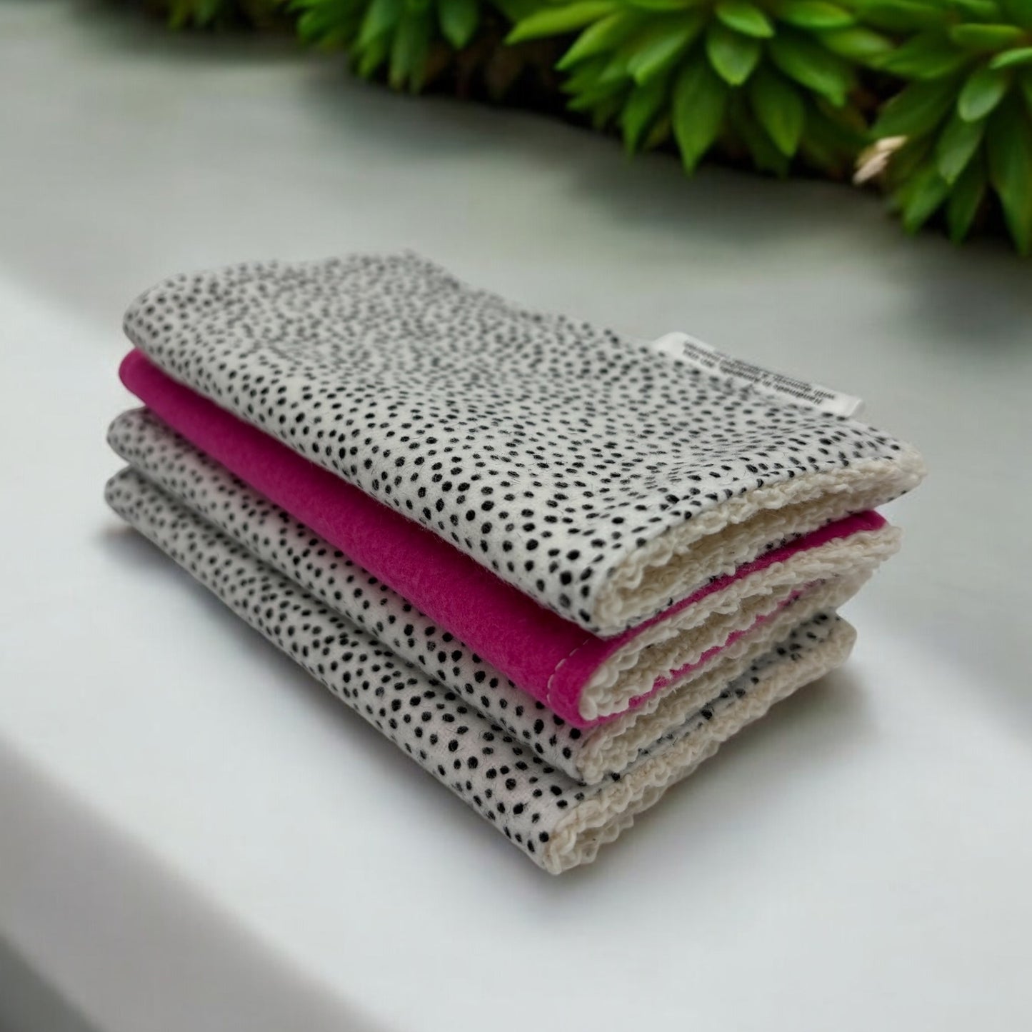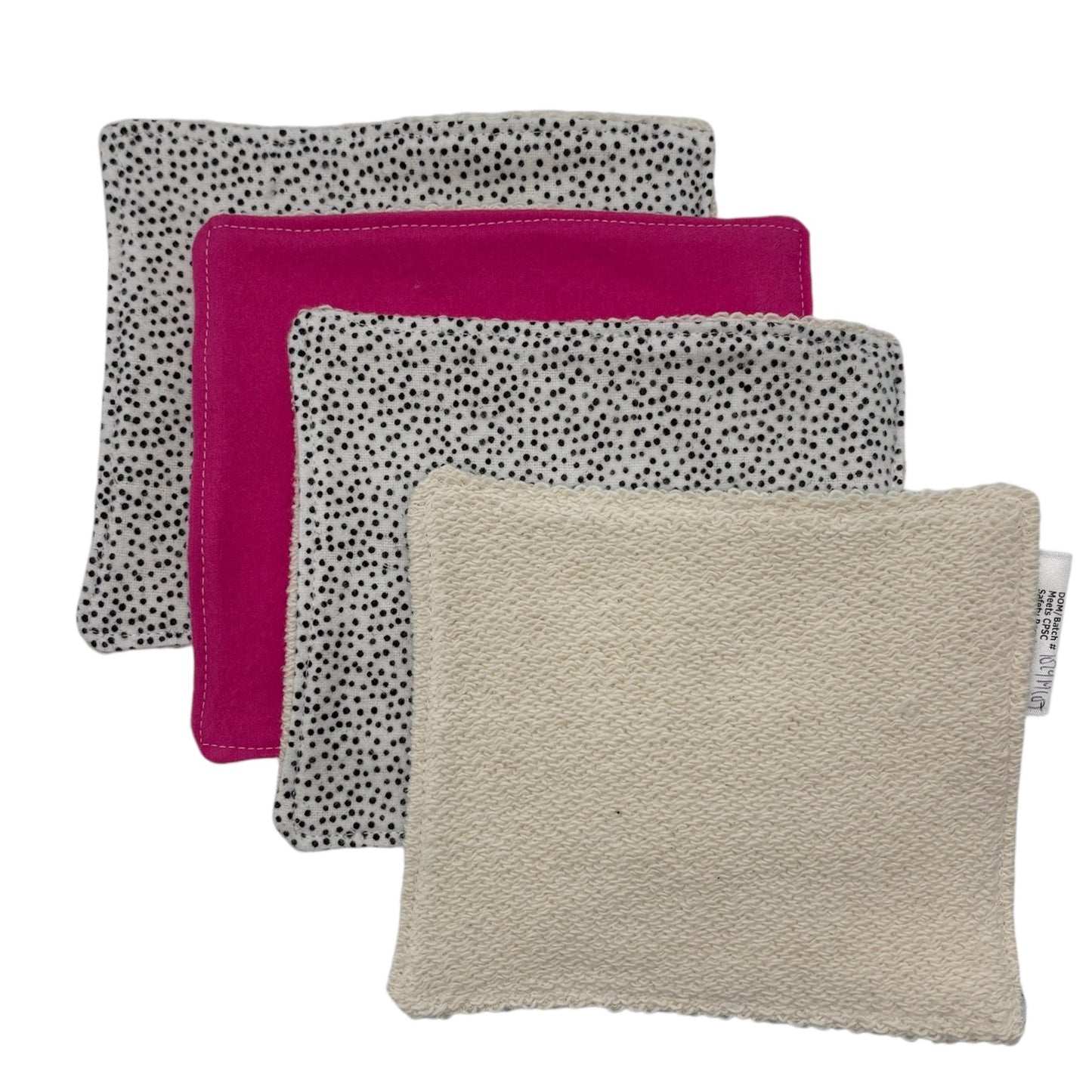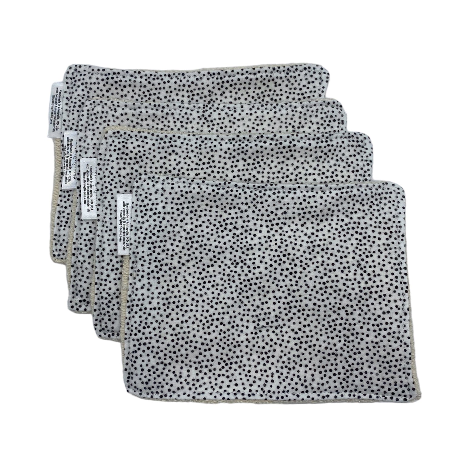 4 hand-sewn, reusable wash cloths in MINI size. Made of 100% organic french terry cotton on one side and 100% flannel with white dots on navy all over on the other. Measures 6 x 4.5 inches and can be used as baby wipes, face wipes, toddler napkins, or family cloth. Say goodbye to disposable wipes, cotton balls, and facial rounds. Use for scrubbing messes, applying skincare, cleansing, or removing makeup. Flannel becomes more absorbent with each wash. Simply wash with like colors on warm and tumble dry low. For a polished look, iron as needed.